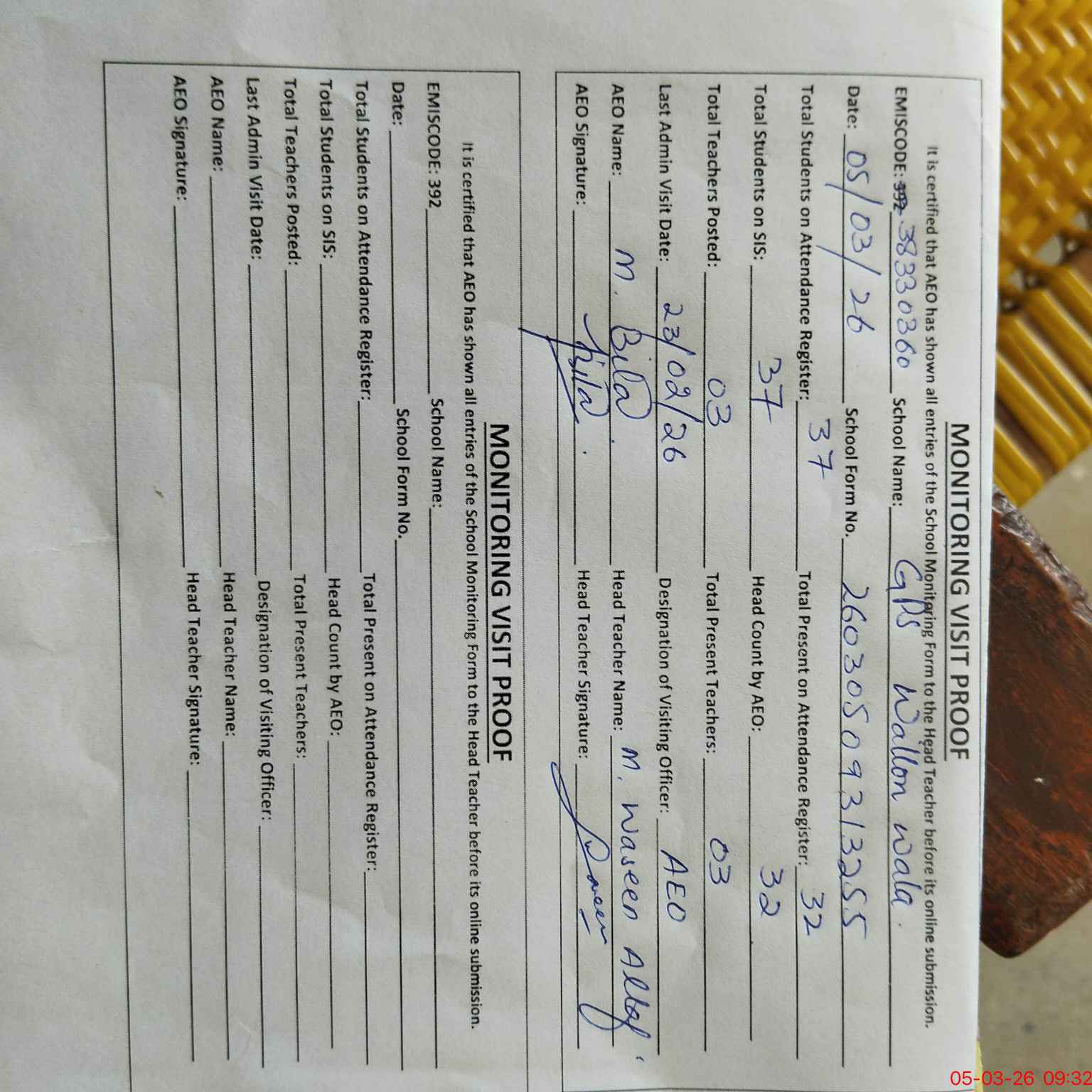 | Name: Mu**** Wa**** Al**** Designation: (School Headmaster's/Headmistress's) PST Phone/Cell Number: 03**** |