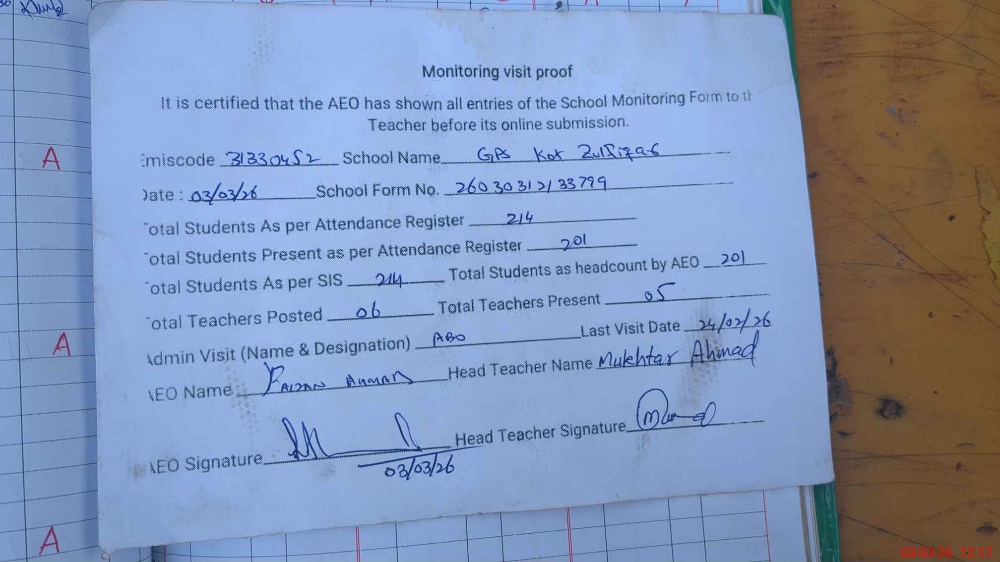 | Attendance Register | Head Teacher | MEA with School | Visit Proof |