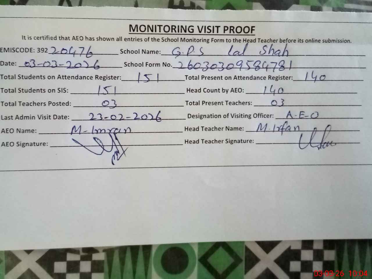 | Monitoring Date: 03-03-2026 | Start Time: 03-03-2026 09:42 AM | End Time: 03-03-2026 10:11 AM | Name of MEA: Mu**** Im**** | |
