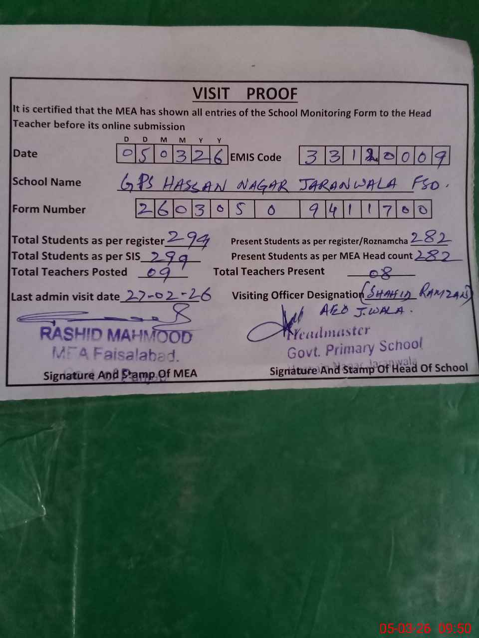 | Attendance Register | Head Teacher | MEA with School | Visit Proof |
