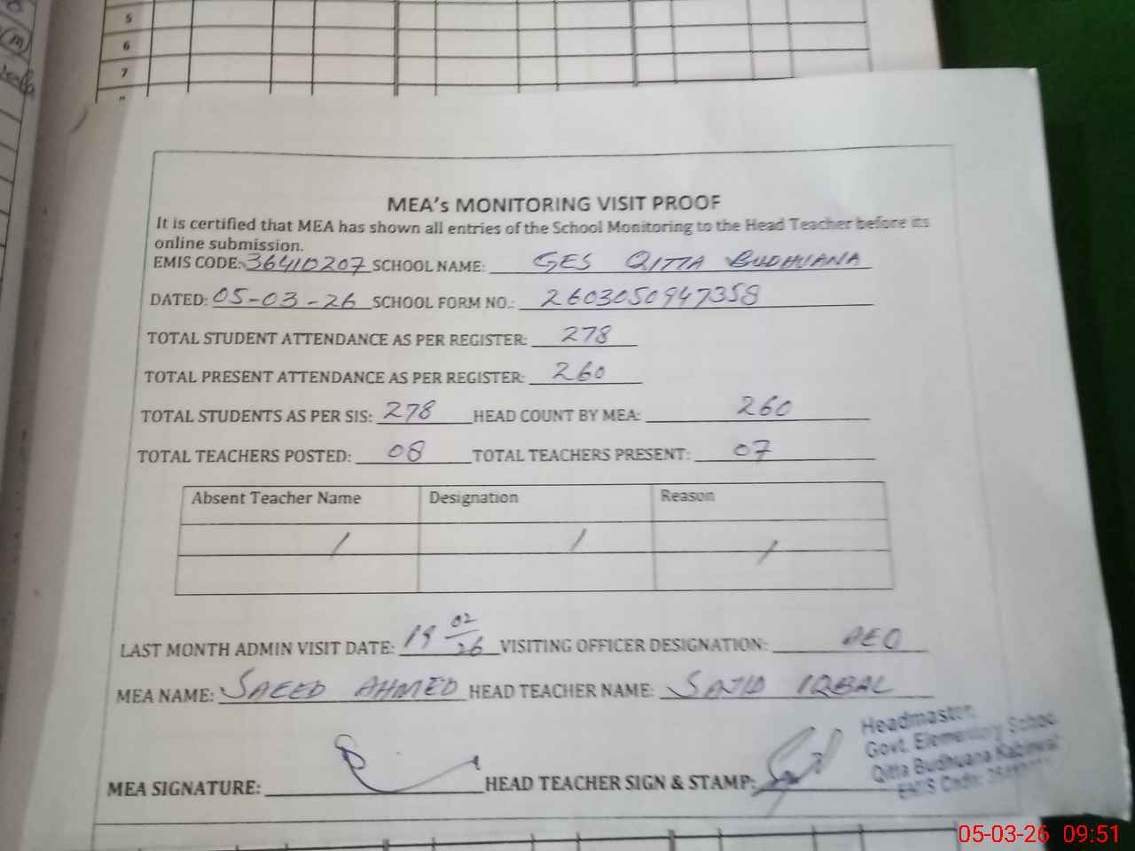 | Attendance Register | Head Teacher | MEA with School | Visit Proof |