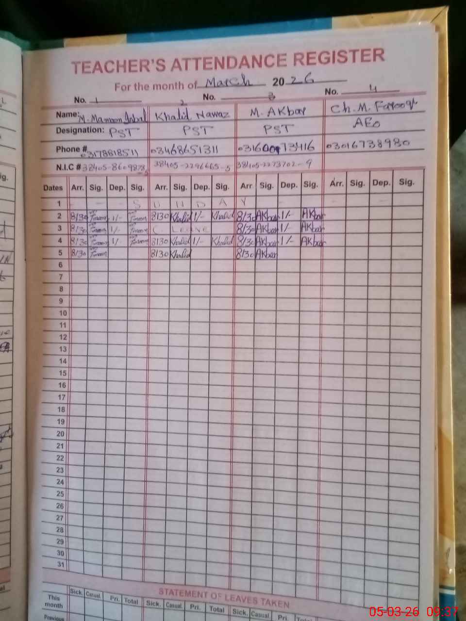 | Name: Mu**** Ma**** Iq**** Designation: (School Headmaster's/Headmistress's) PTC/JV Phone/Cell Number: 03**** |