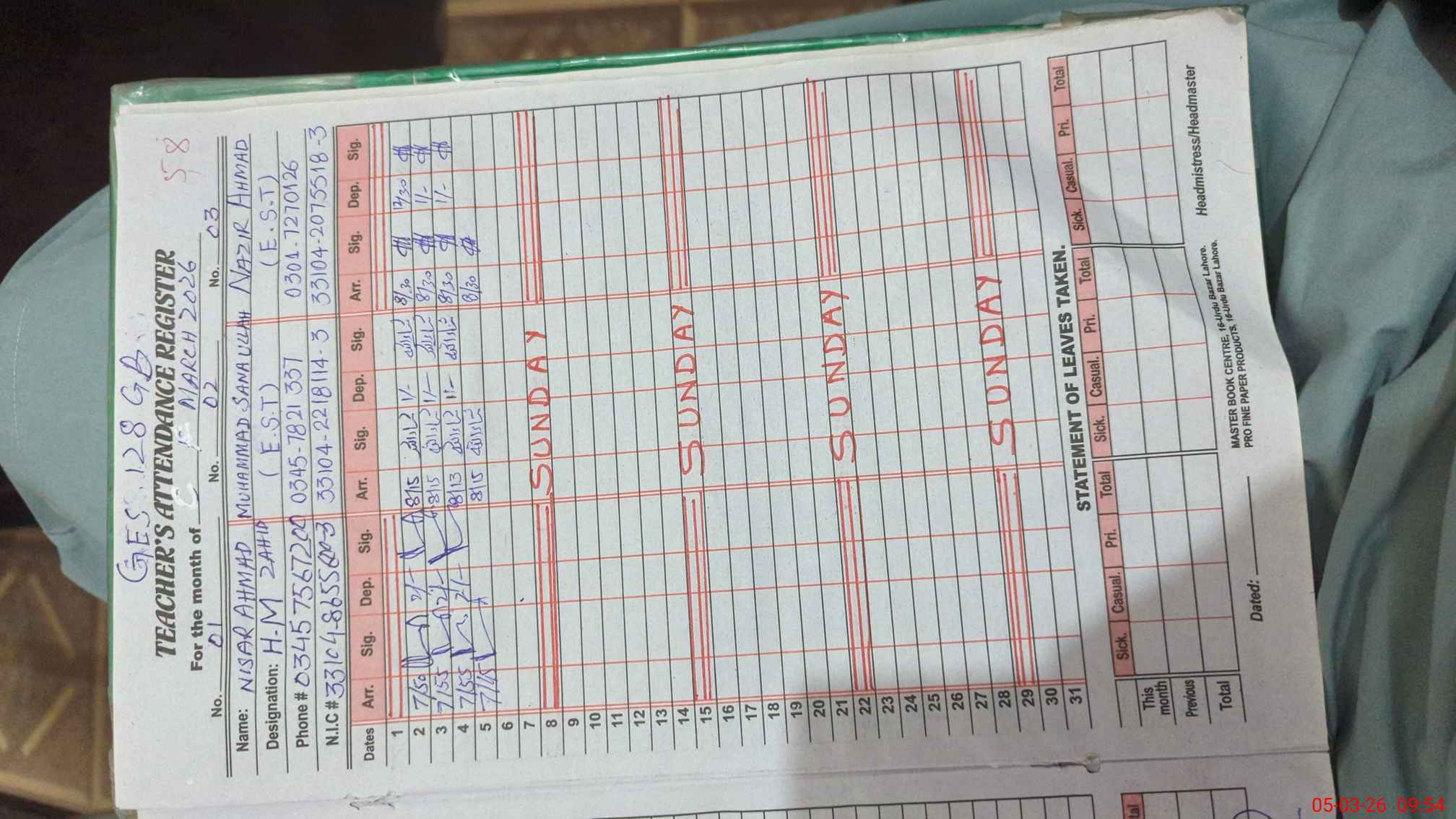 | Name: Ni**** Ah**** Designation: (School Headmaster's/Headmistress's) ES.T.(GENERAL) Phone/Cell Number: 03**** |