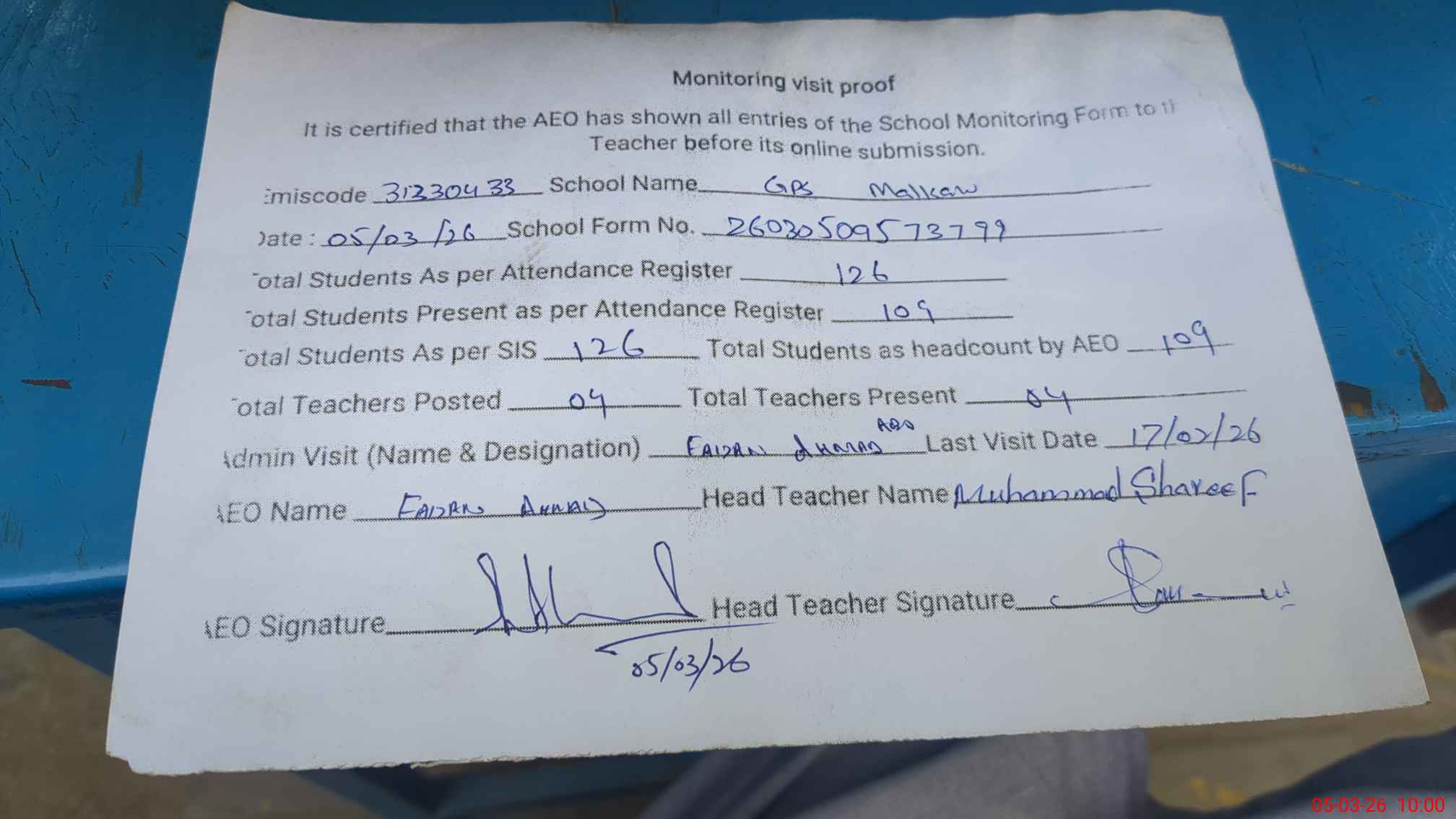 | Attendance Register | Head Teacher | MEA with School | Visit Proof |