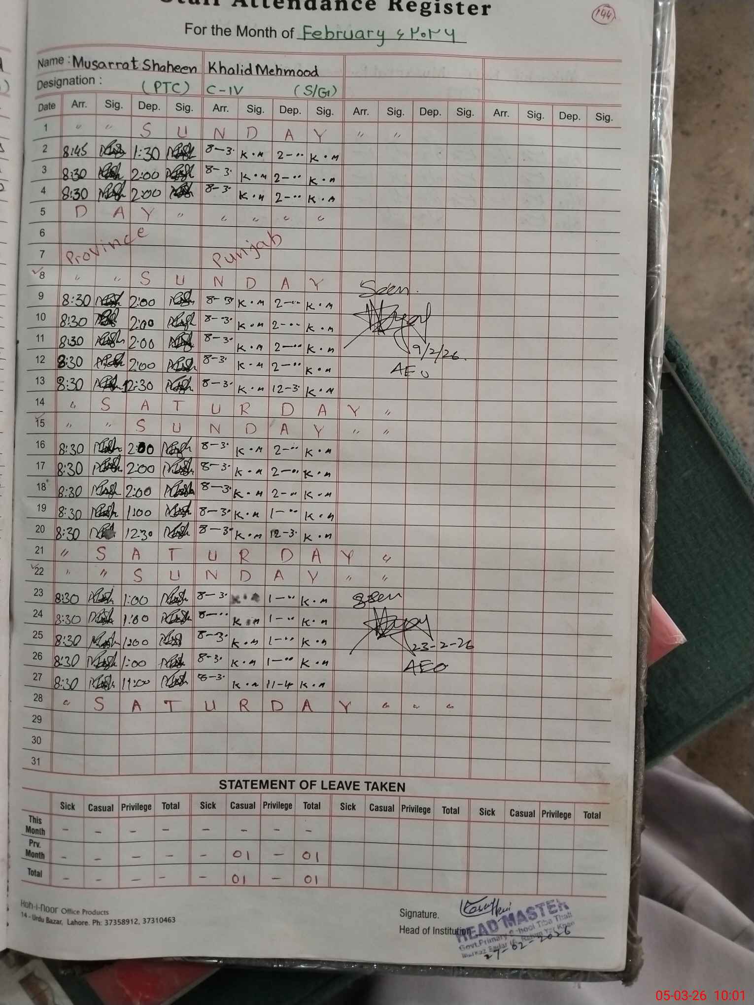 | Name: Mu**** Ka**** Ra**** Designation: (School Headmaster's/Headmistress's) PST Phone/Cell Number: 03**** |