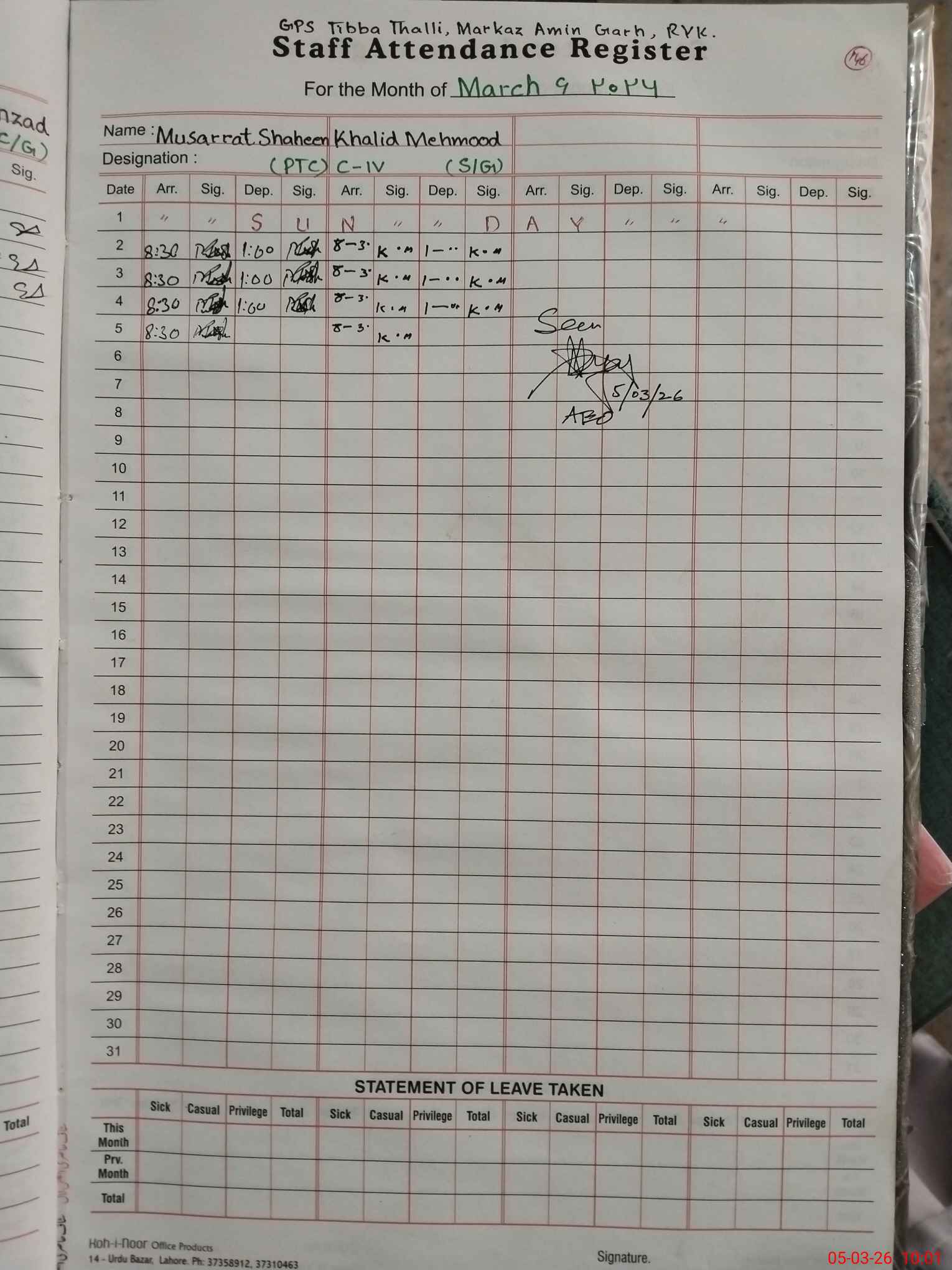 | CNIC | Full Name | Designation | R/C | Absence During Last Calender Month |