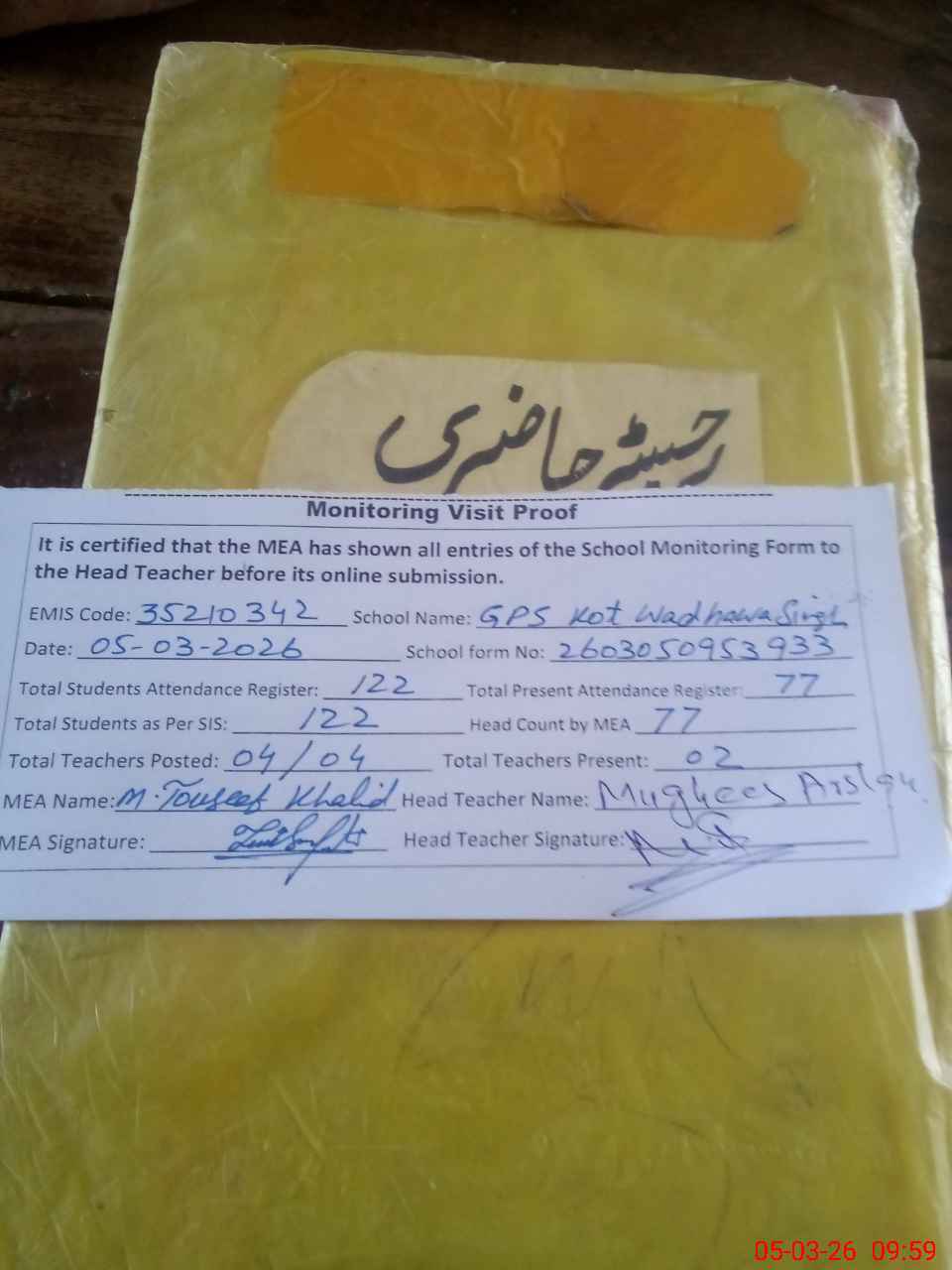| Attendance Register | Head Teacher | MEA with School | Visit Proof |