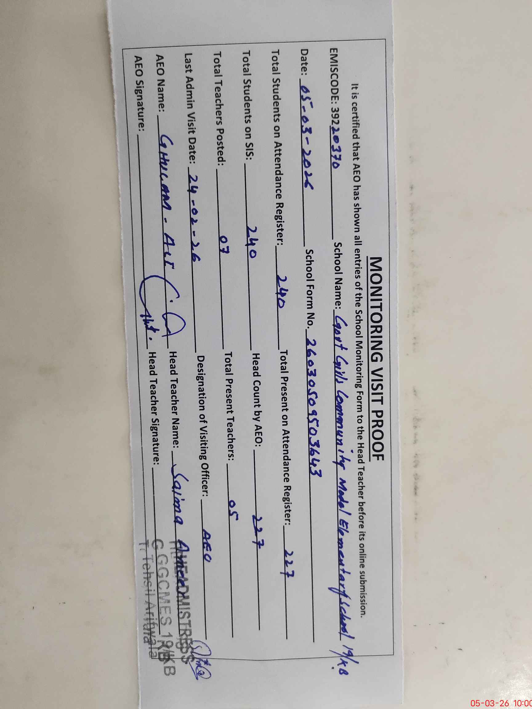 | Certified that this School was Inspected by the Undersigned MEA/DMO Today and the Information Stated Above is as Per Record. | |||||