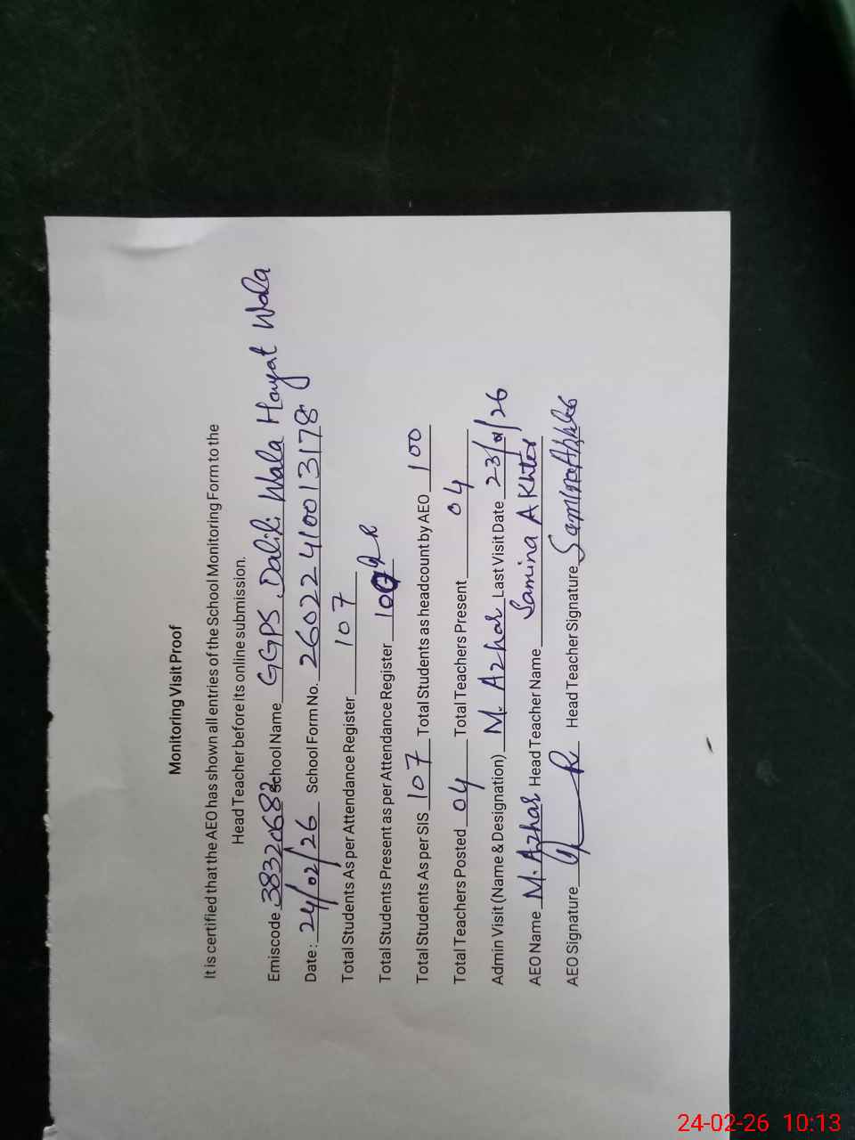 | Monitoring Date: 24-02-2026 | Start Time: 24-02-2026 09:37 AM | End Time: 24-02-2026 10:20 AM | Name of MEA: Mu**** Az**** | |