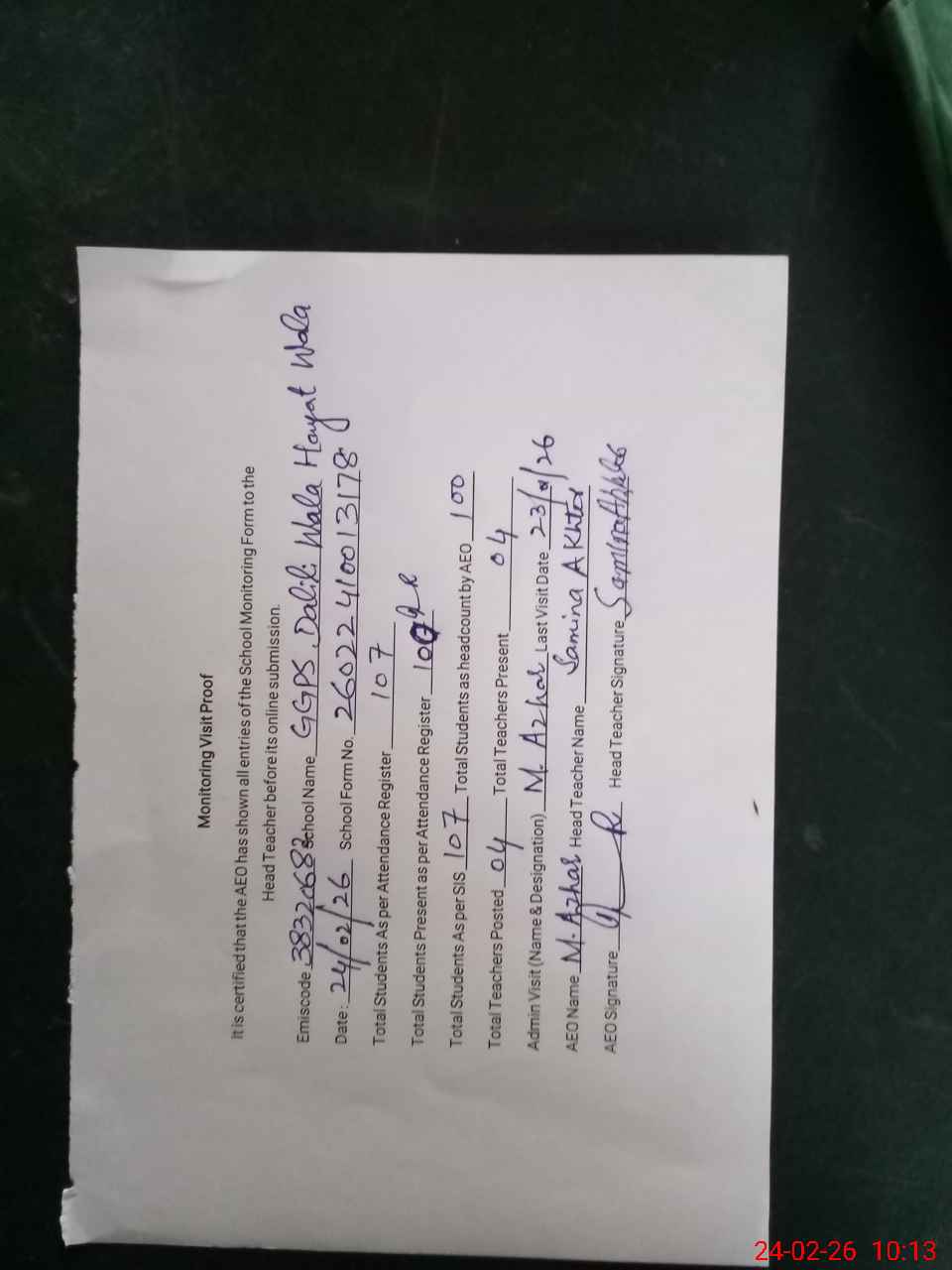 | Attendance Register | Head Teacher | MEA with School | Visit Proof |