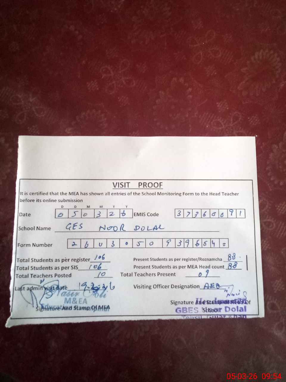 | Attendance Register | Head Teacher | MEA with School | Visit Proof |