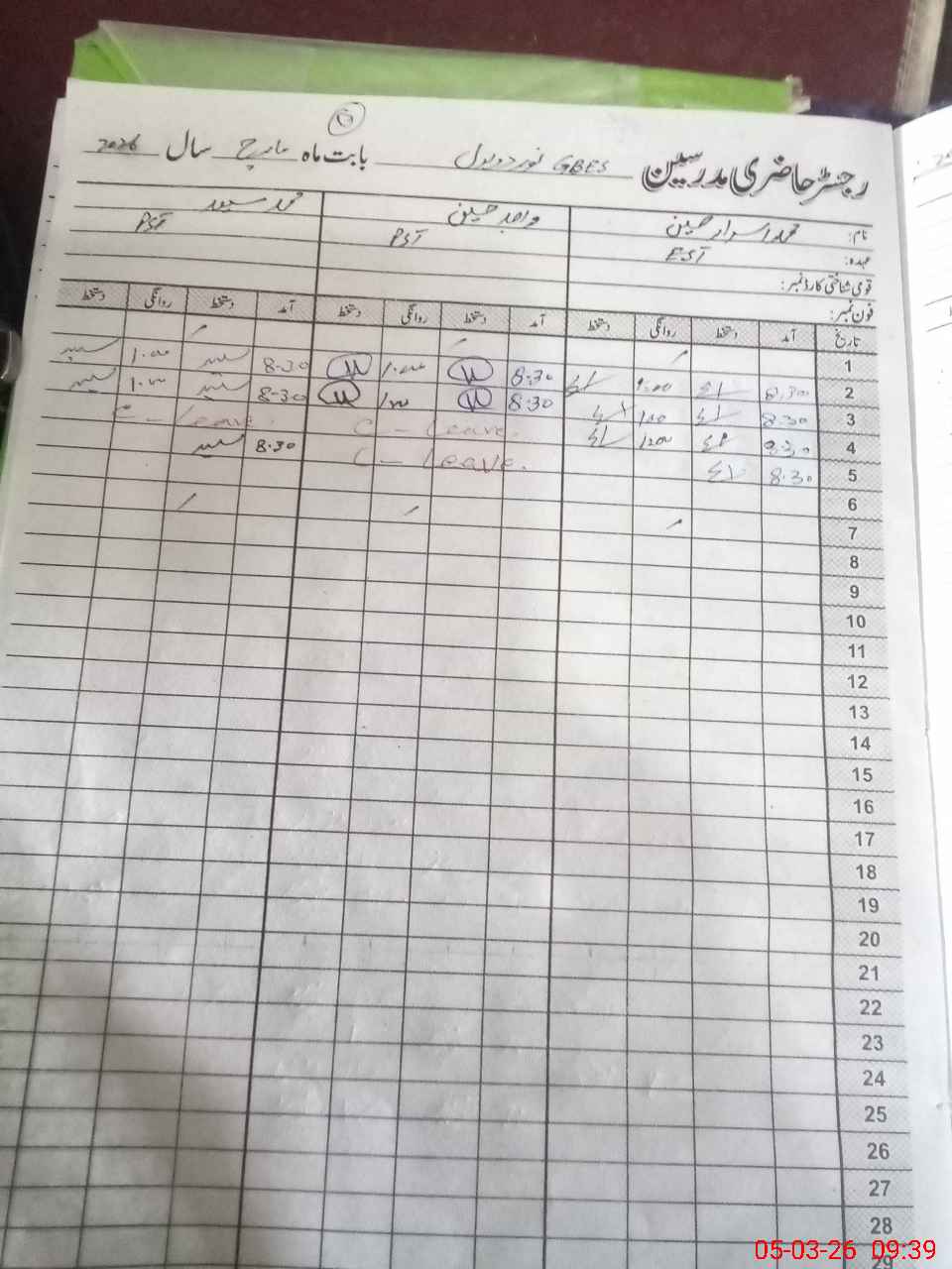 | CNIC | Full Name | Designation | R/C | Absence during last cal. month |