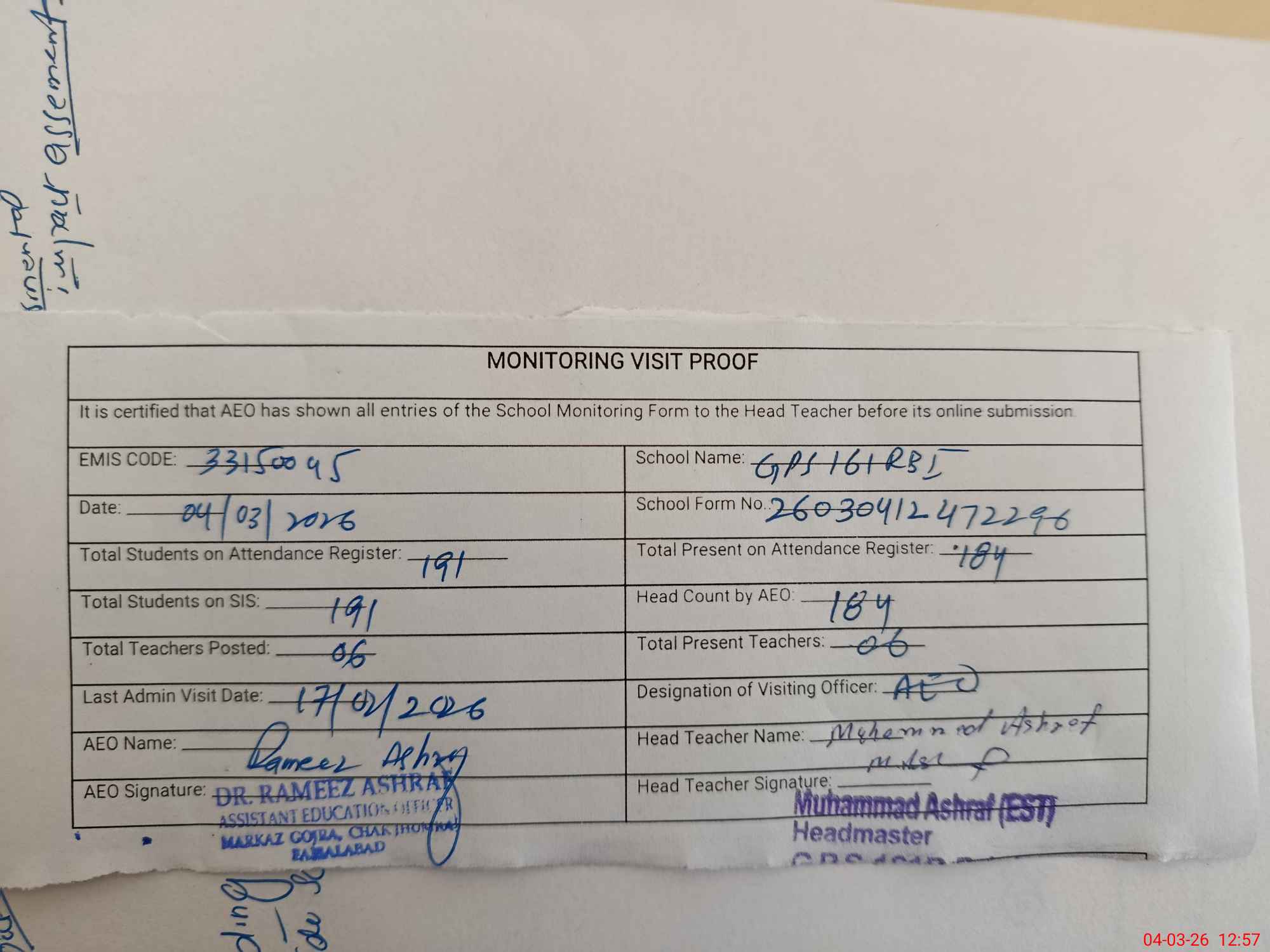 | Attendance Register | Head Teacher | MEA with School | Visit Proof |
