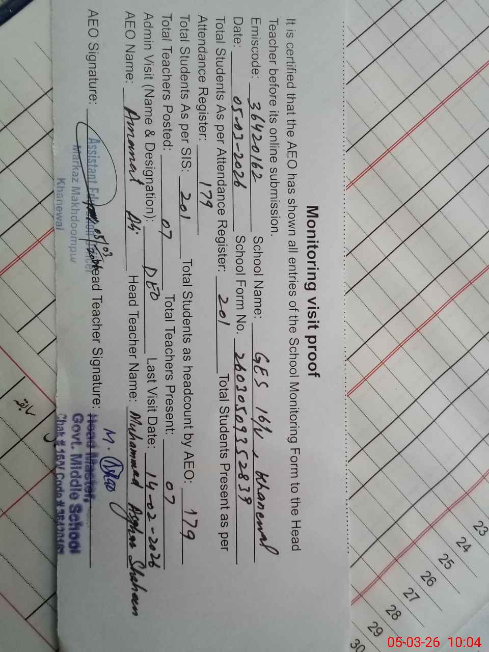 | Attendance Register | Head Teacher | MEA with School | Visit Proof |