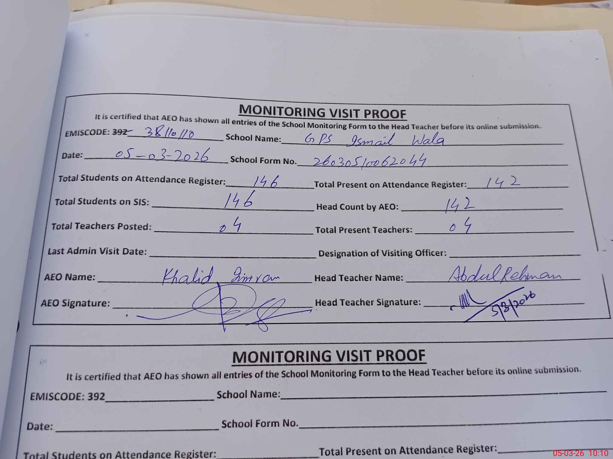 | Monitoring Date: 05-03-2026 | Start Time: 05-03-2026 09:41 AM | End Time: 05-03-2026 10:10 AM | Name of MEA: Kh**** Im**** | |
