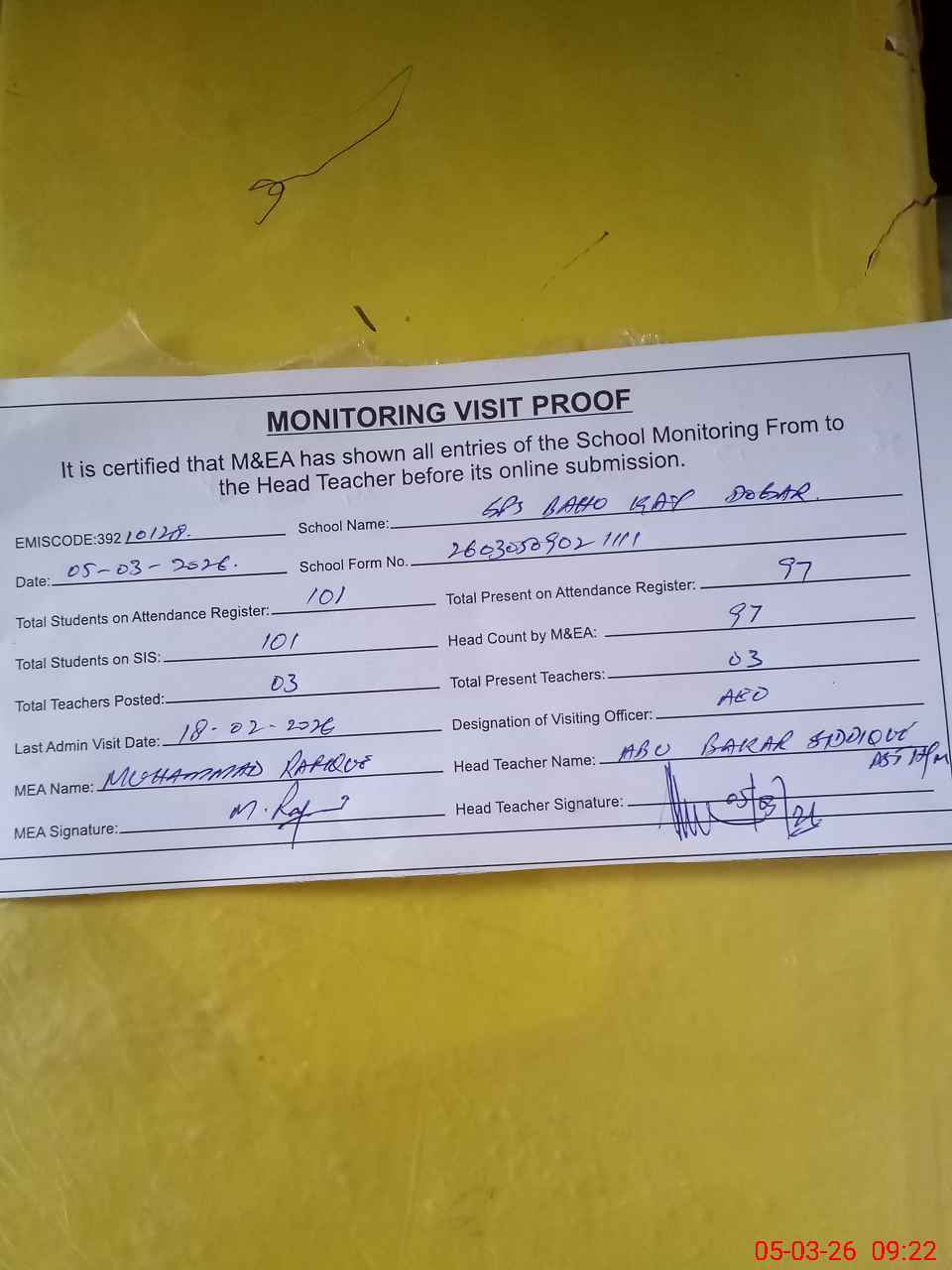 | Attendance Register | Head Teacher | MEA with School | Visit Proof |