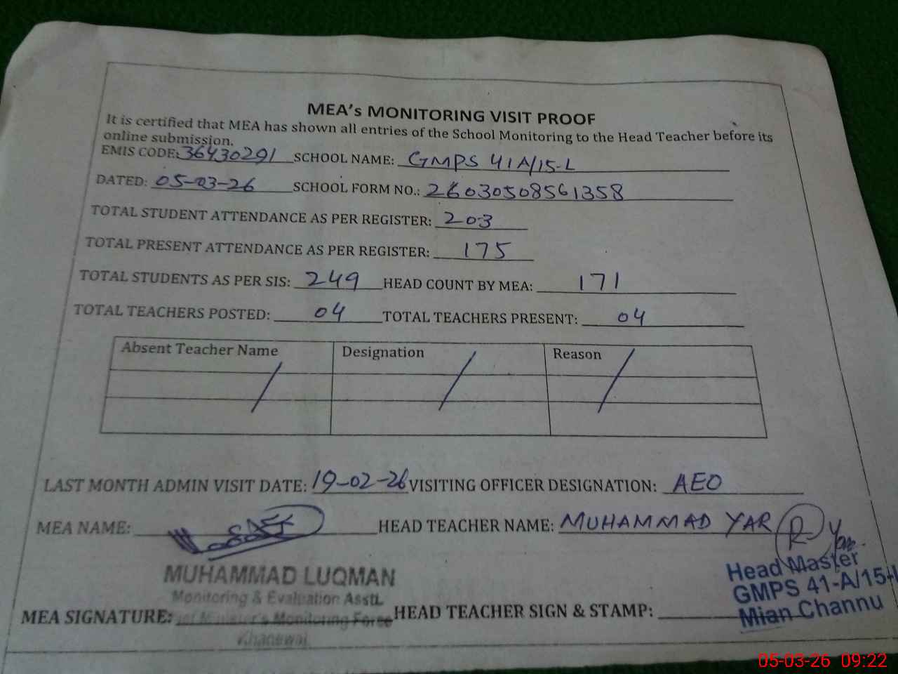 | EMIS Code: 36430291 | Name of School: GMPS 41-A/15-L, MIAN CHANNU | |||