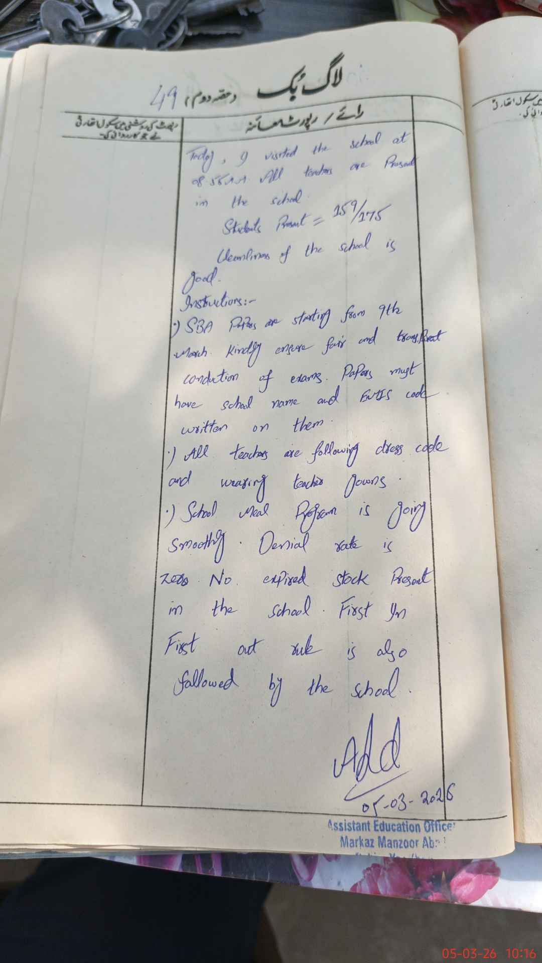 | Certified that this School was Inspected by the Undersigned MEA/DMO Today and the Information Stated Above is as Per Record. | |||||