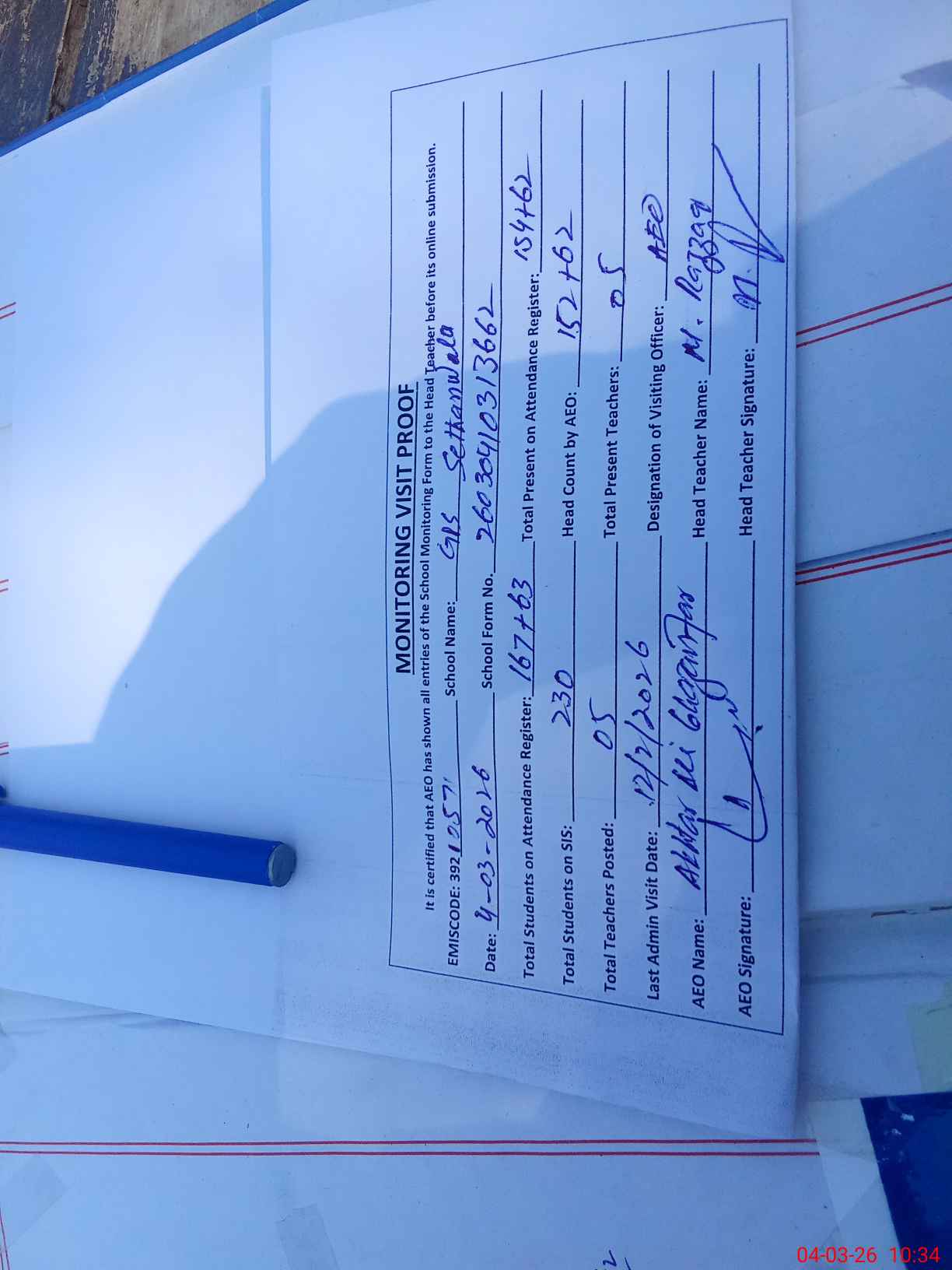 | Attendance Register | Head Teacher | MEA with School | Visit Proof |