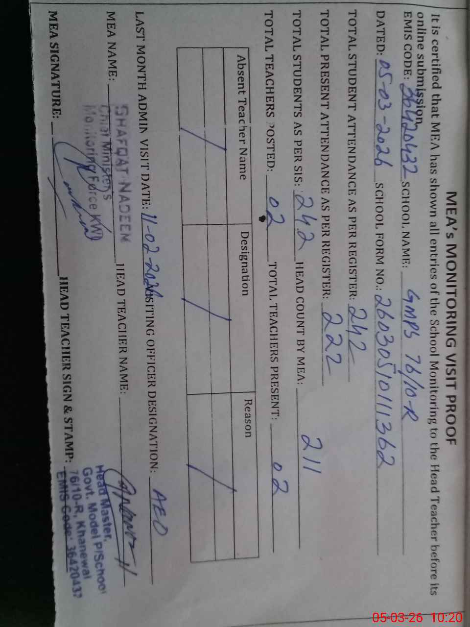 | EMIS Code: 36420432 | Name of School: GMPS 76/10-R, KHANEWAL | |||