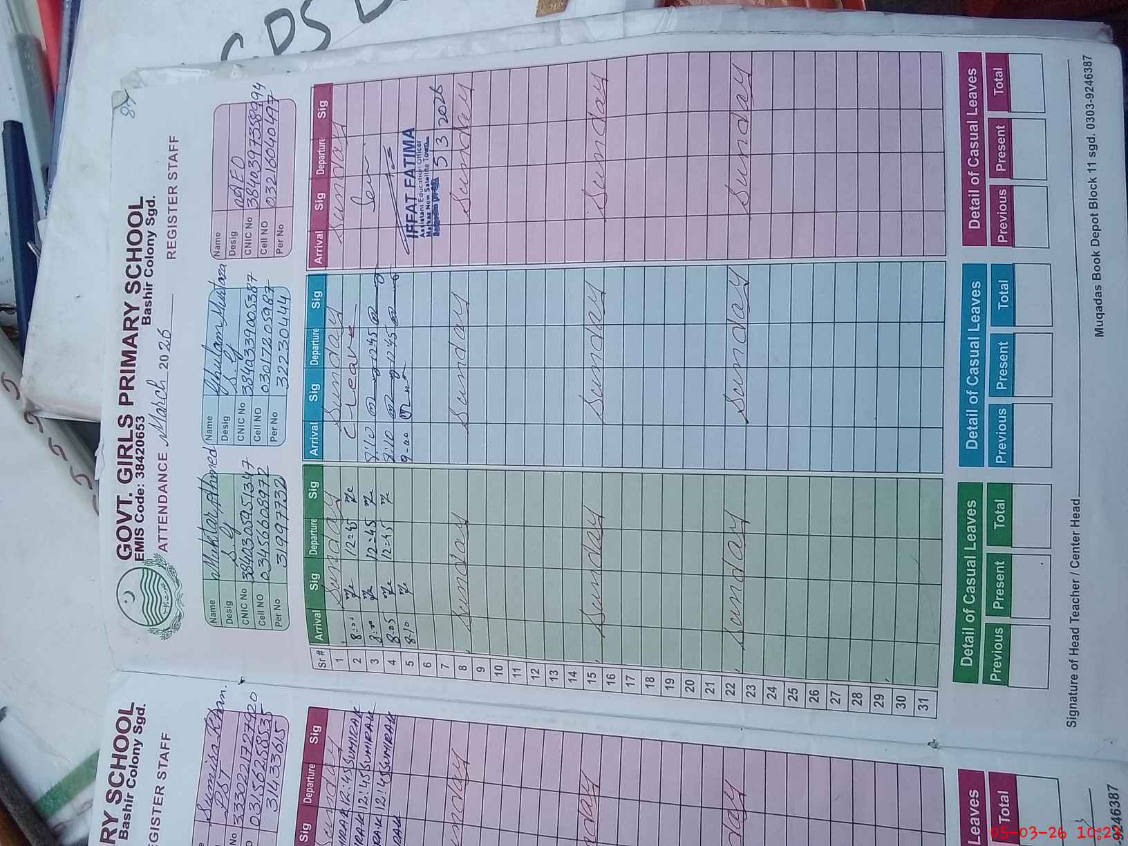 | Name: BU**** QA**** Designation: (School Headmaster's/Headmistress's) PST Phone/Cell Number: 03**** |