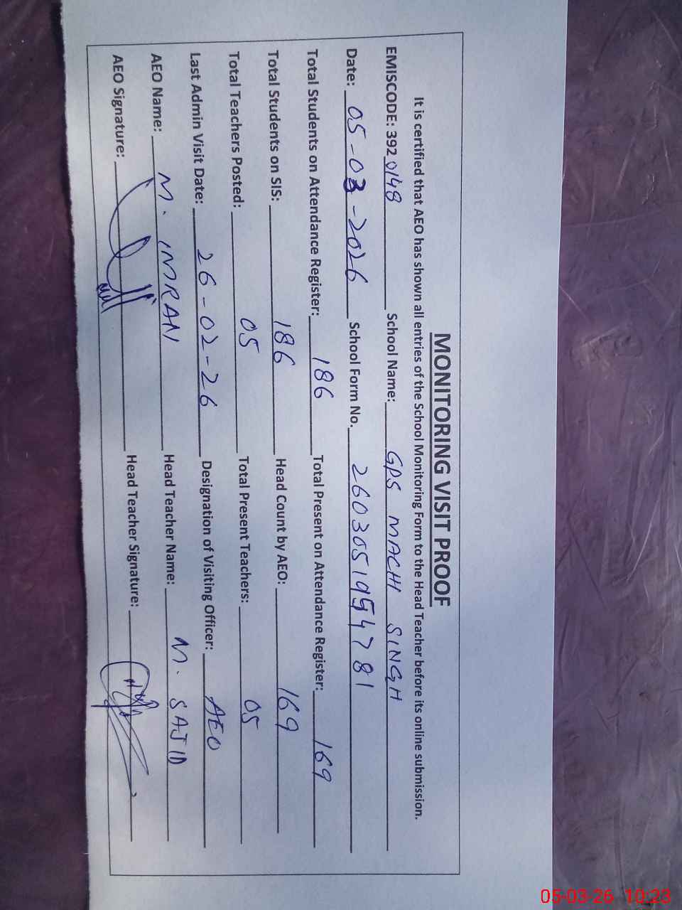 | Monitoring Date: 05-03-2026 | Start Time: 05-03-2026 09:46 AM | End Time: 05-03-2026 10:24 AM | Name of MEA: Mu**** Im**** | |