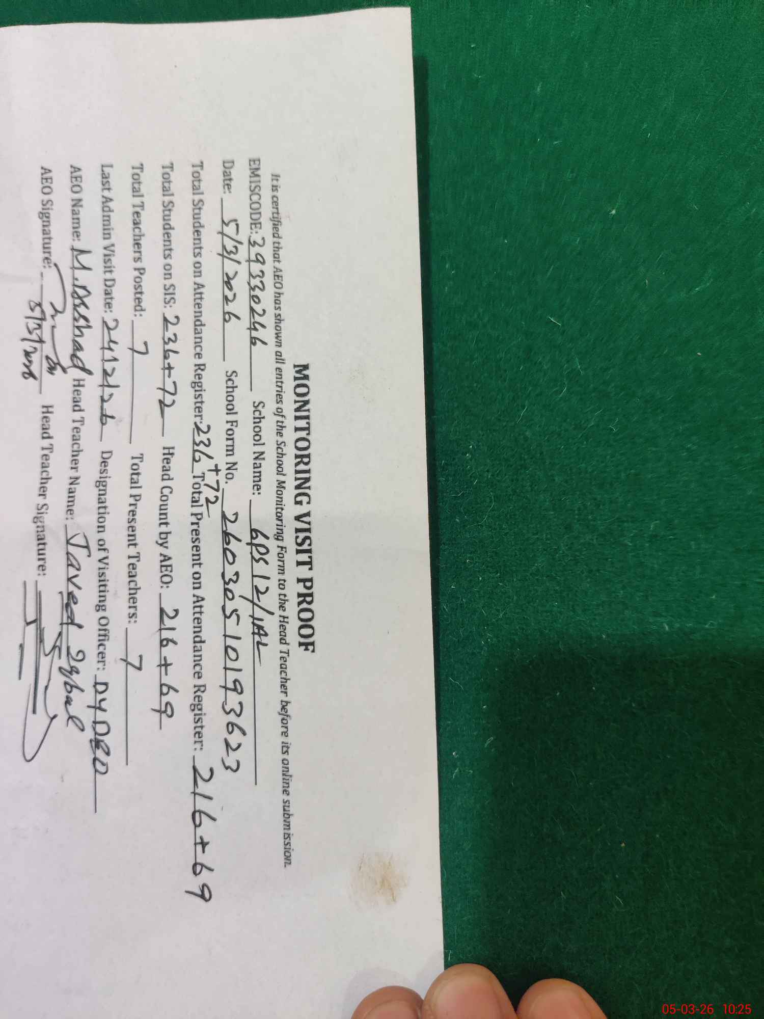 | Certified that this School was Inspected by the Undersigned MEA/DMO Today and the Information Stated Above is as Per Record. | |||||