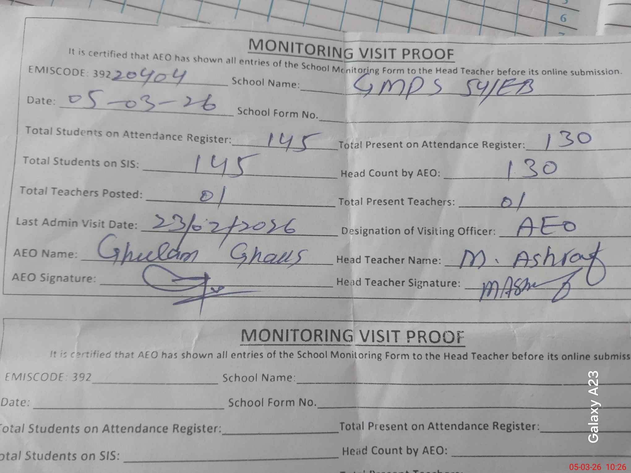| Attendance Register | Head Teacher | MEA with School | Visit Proof |