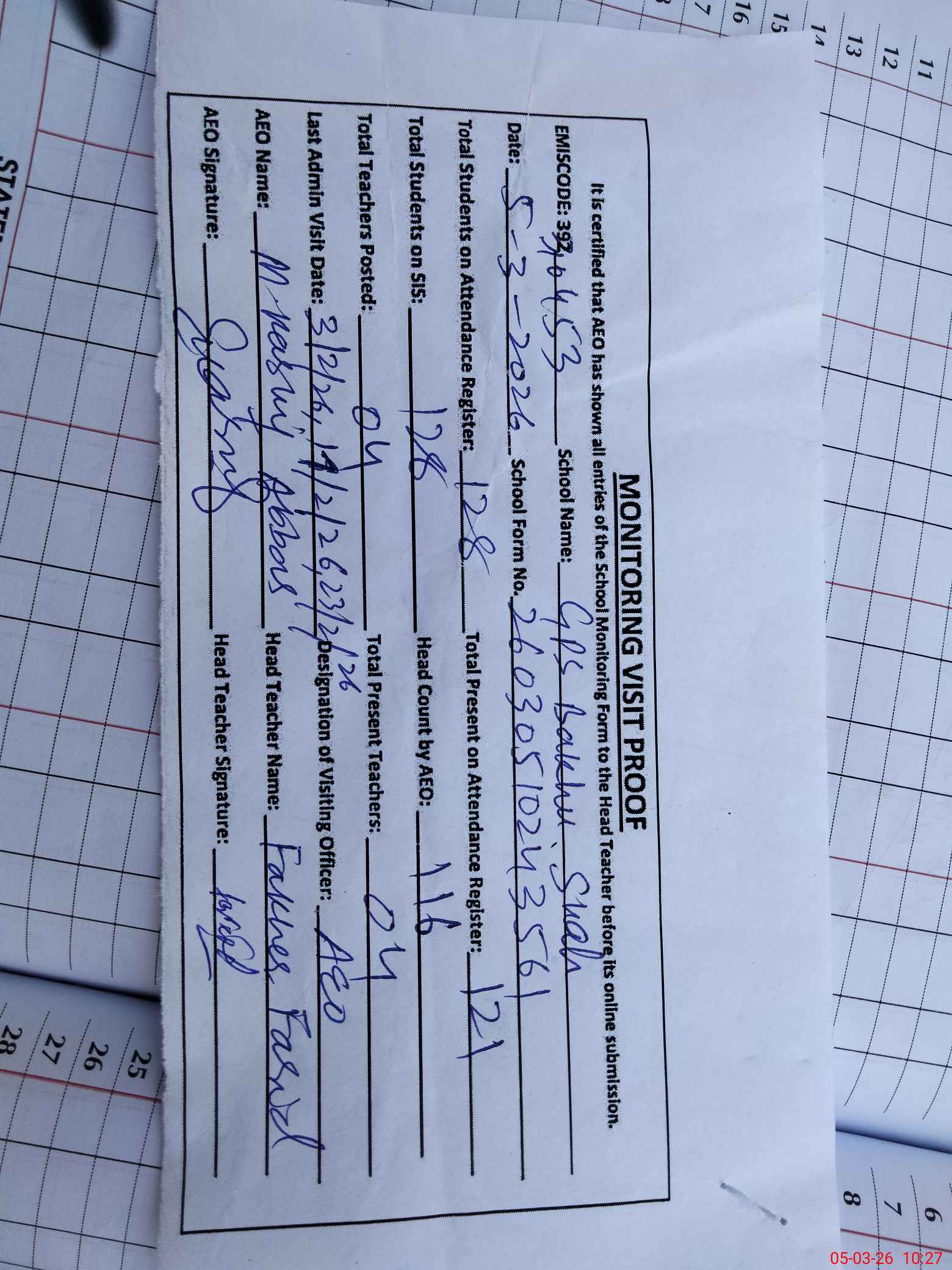 | Attendance Register | Head Teacher | MEA with School | Visit Proof |