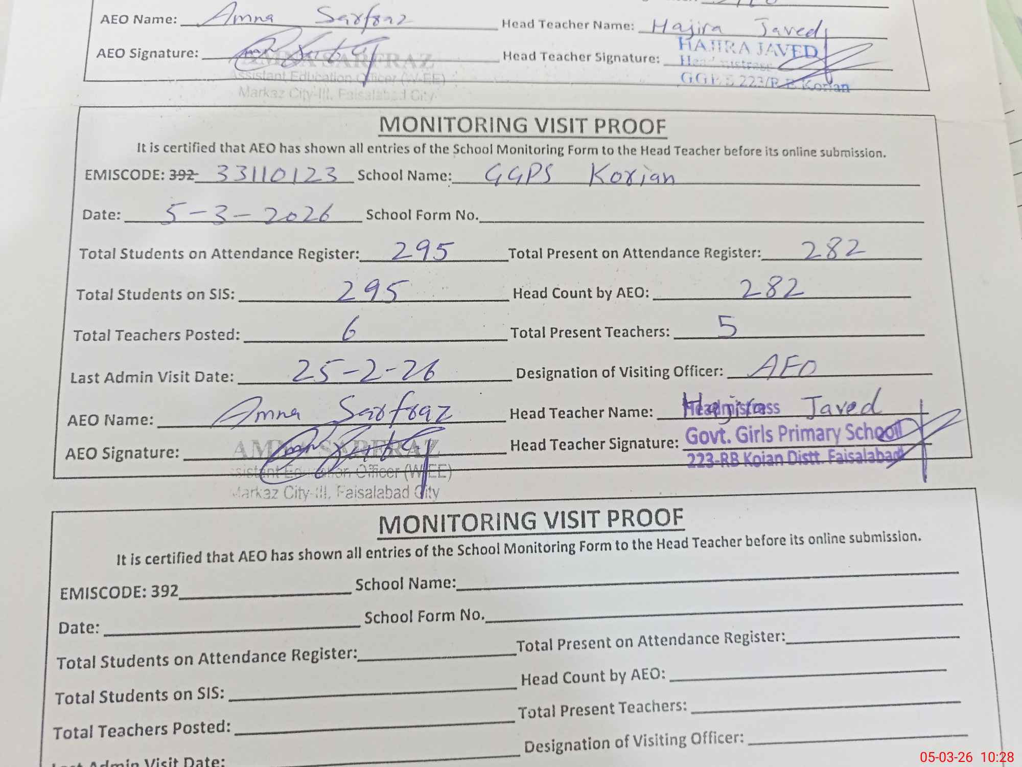 | Monitoring Date: 05-03-2026 | Start Time: 05-03-2026 10:24 AM | End Time: 05-03-2026 10:28 AM | Name of MEA: AM**** SA**** | |