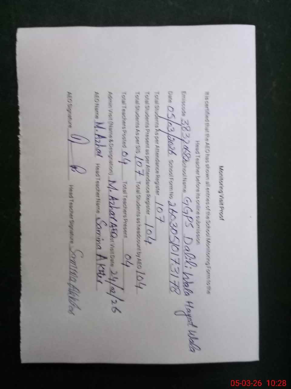 | Attendance Register | Head Teacher | MEA with School | Visit Proof |