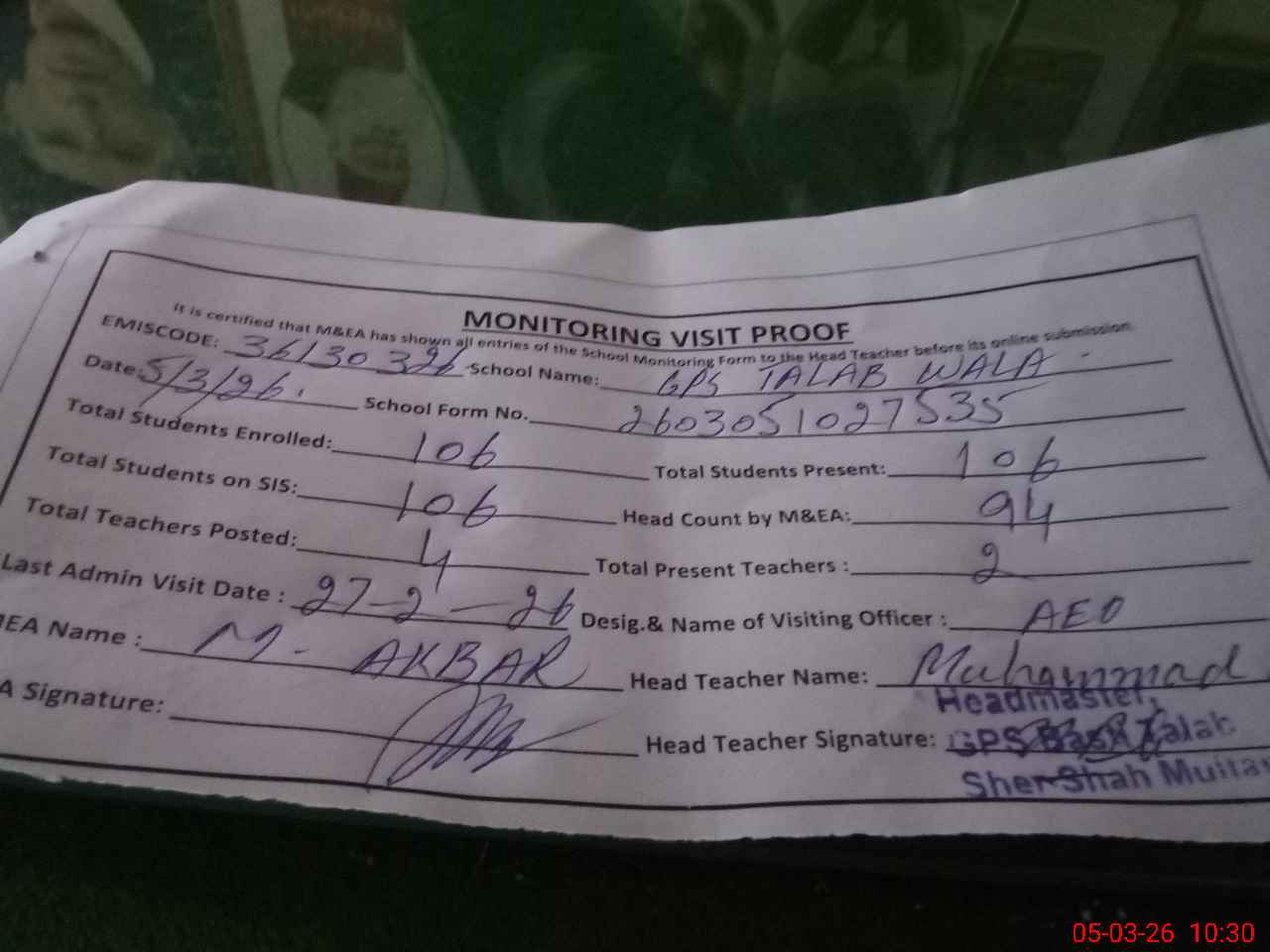 | EMIS Code: 36130326 | Name of School: GPS BASTI TALAB SULTAN PUR HAMER SHER SHAH | |||