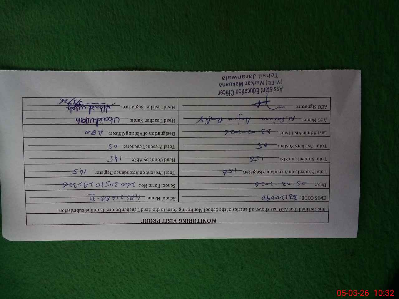 | Certified that this School was Inspected by the Undersigned MEA/DMO Today and the Information Stated Above is as Per Record. | |||||