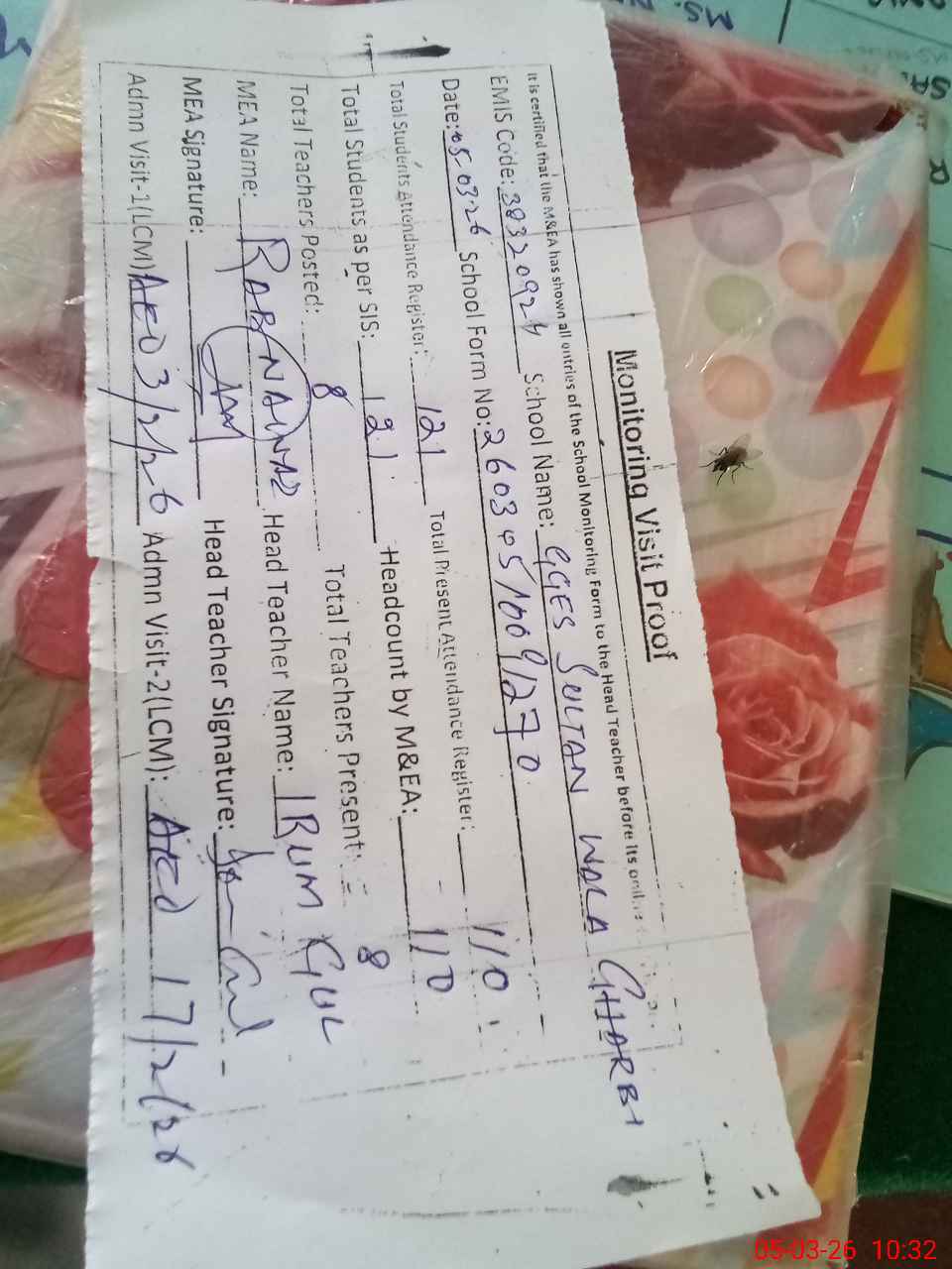 | Attendance Register | Head Teacher | MEA with School | Visit Proof |