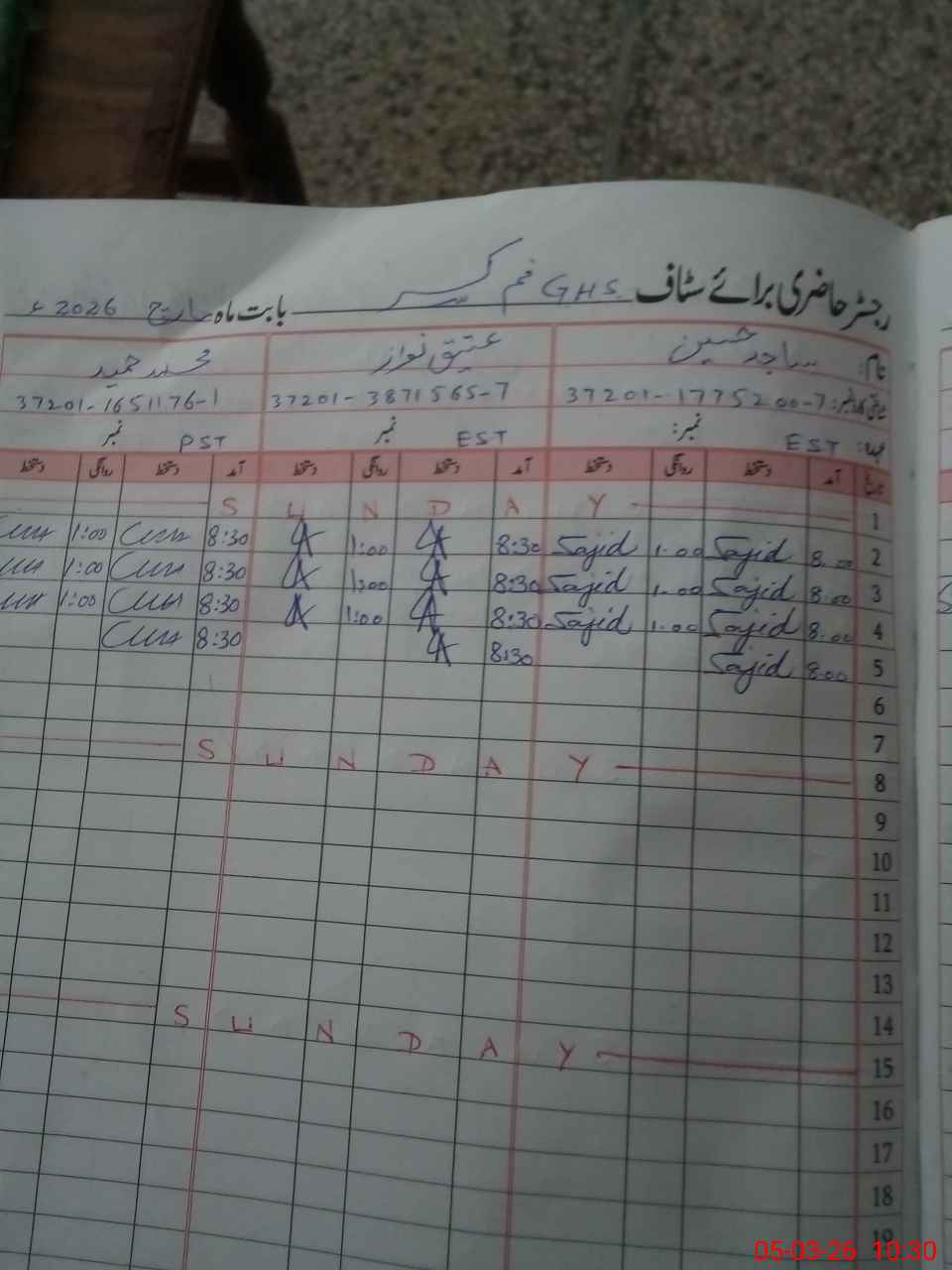 | CNIC | Full Name | Designation | R/C | Absence During Last Calender Month |