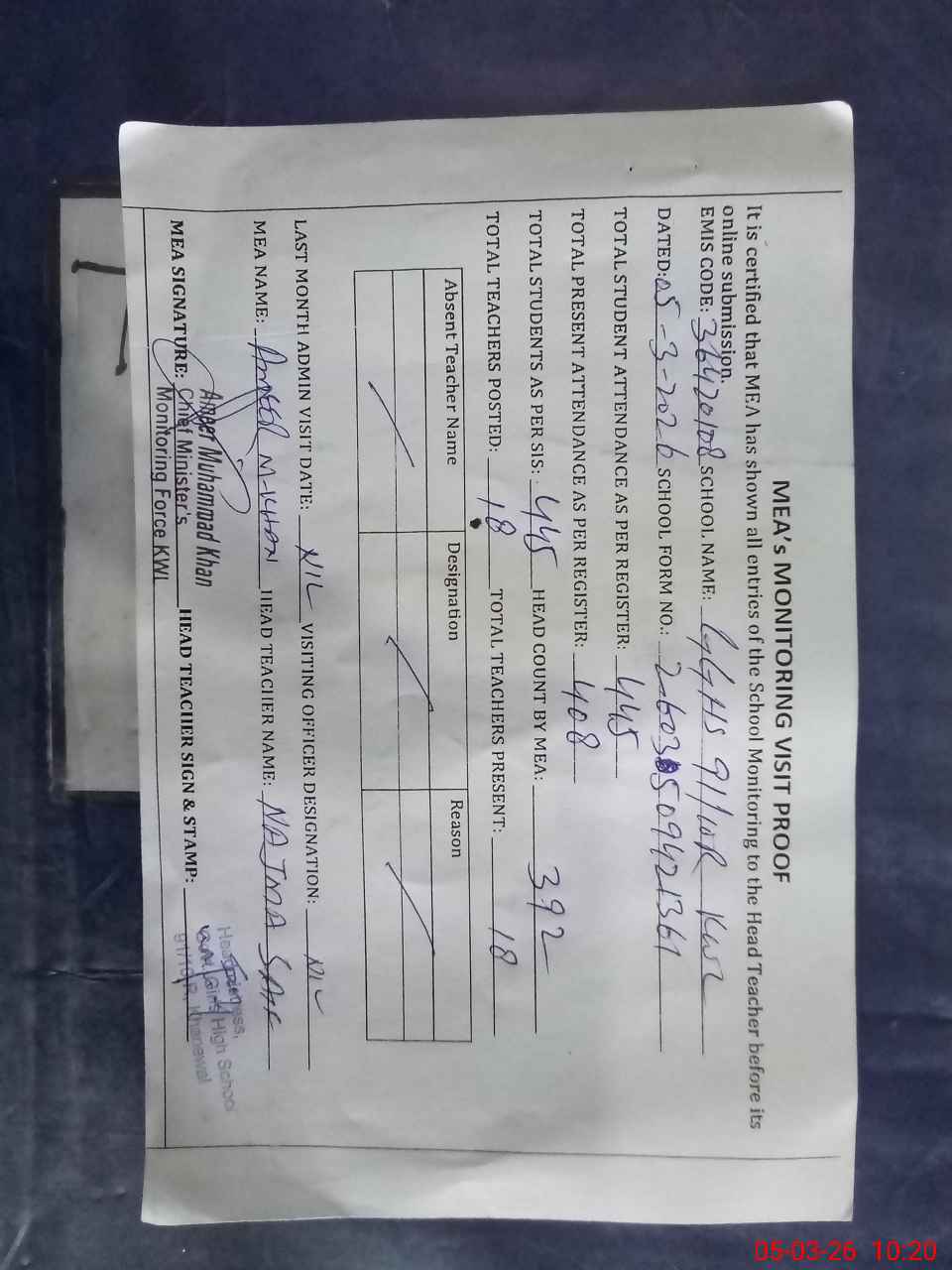 | Attendance Register | Head Teacher | MEA with School | Visit Proof |
