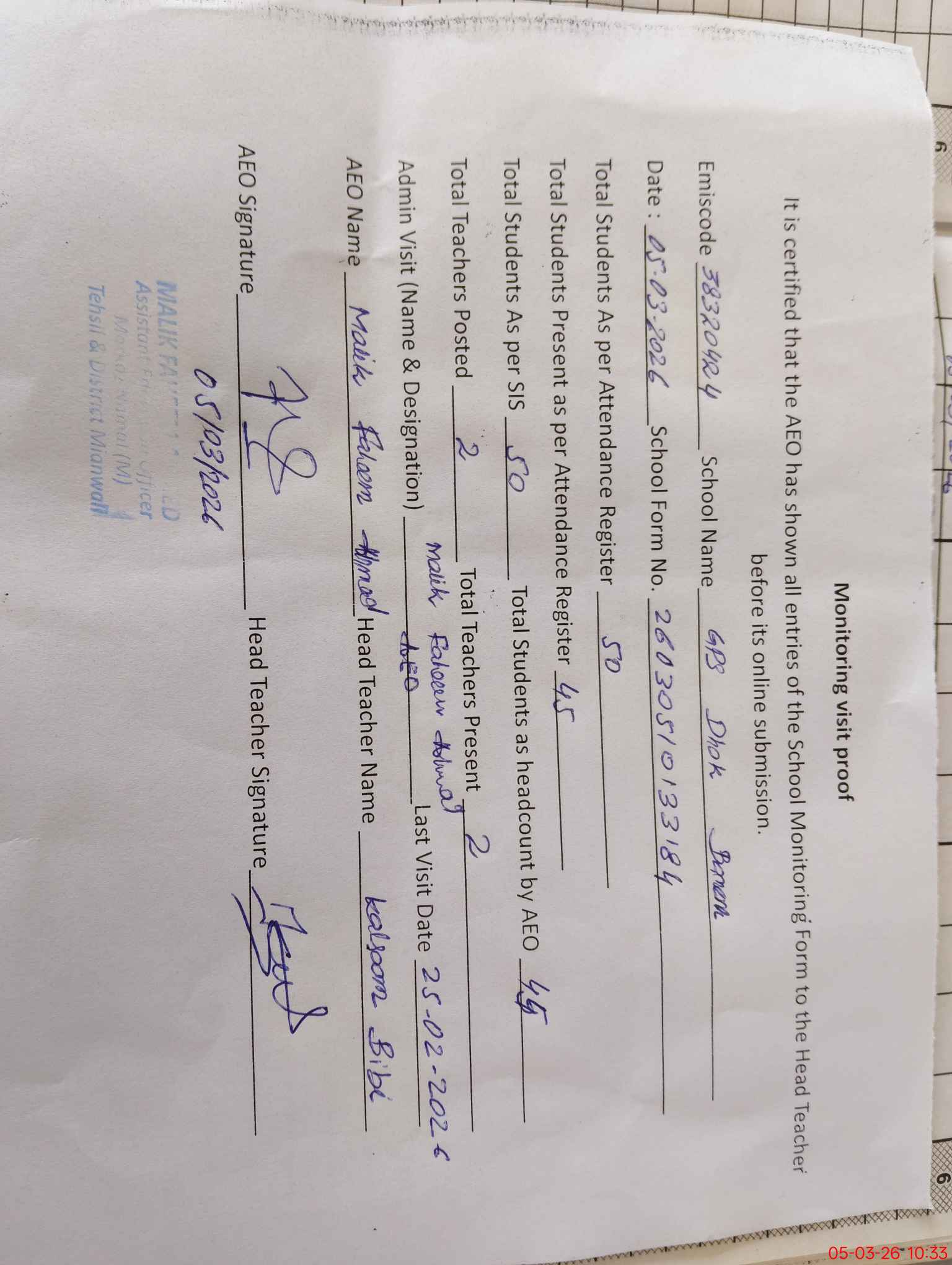 | Certified that this School was Inspected by the Undersigned MEA/DMO Today and the Information Stated Above is as Per Record. | |||||