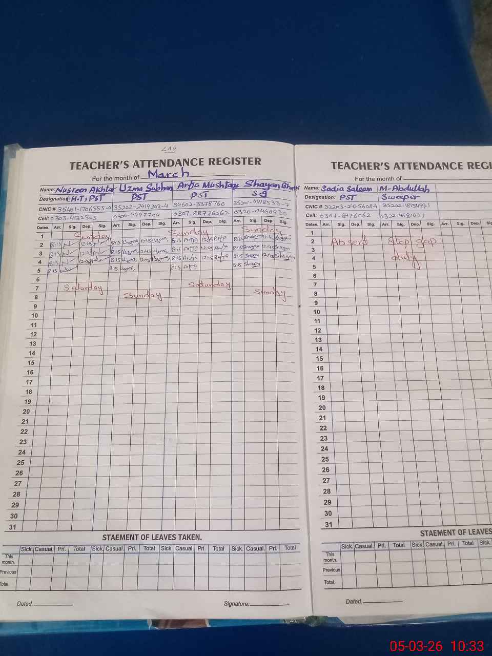 | CNIC | Full Name | Designation | R/C | Absence During Last Calender Month |