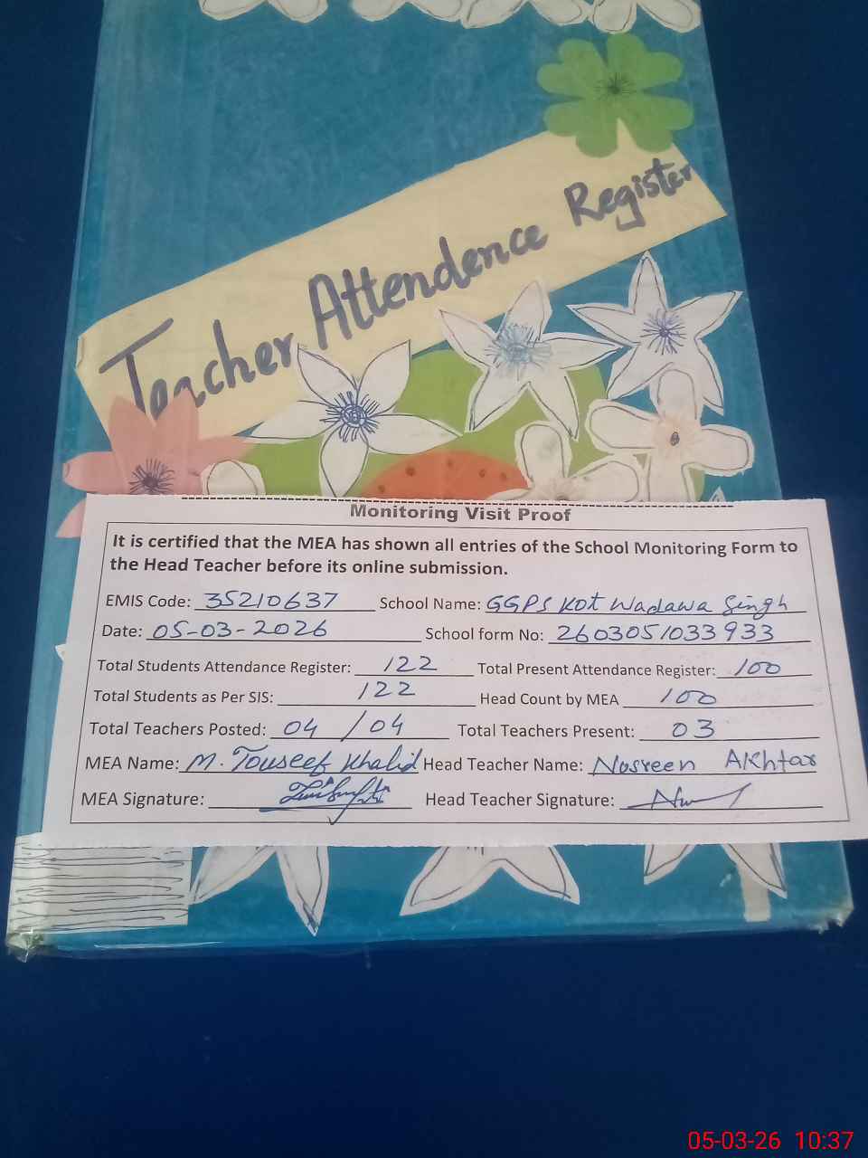 | Attendance Register | Head Teacher | MEA with School | Visit Proof |