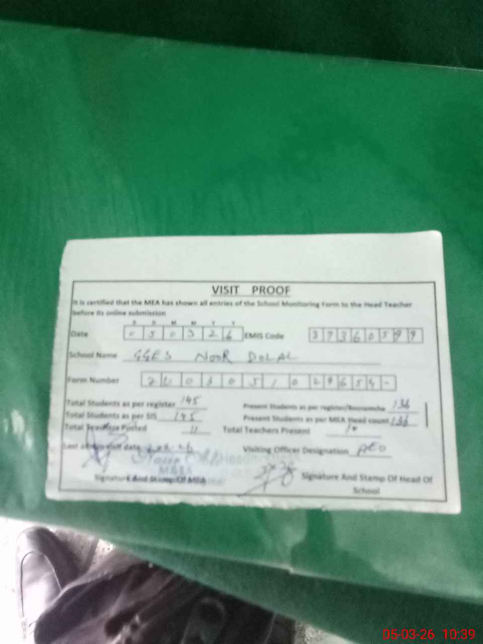 | Attendance Register | Head Teacher | MEA with School | Visit Proof |