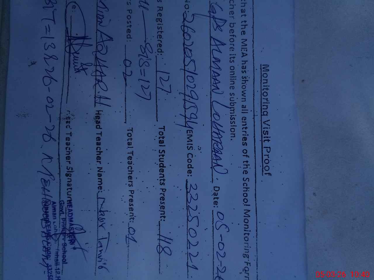 | Name: NA**** TA**** Designation: (School Headmaster's/Headmistress's) PST Phone/Cell Number: 03**** |