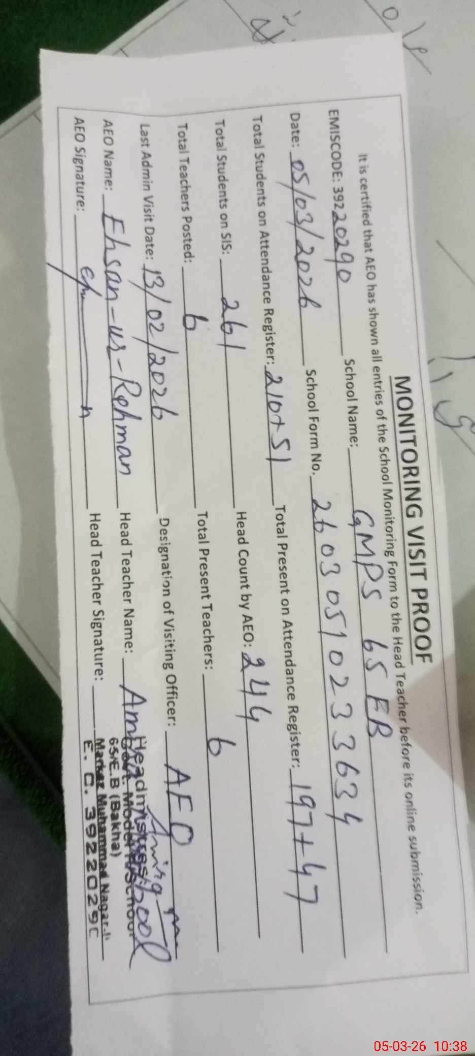 | EMIS Code: 39220290 | Name of School: GMPS 65 EB BAKHA P/O ARIFWALA PAKPATTAN | |||