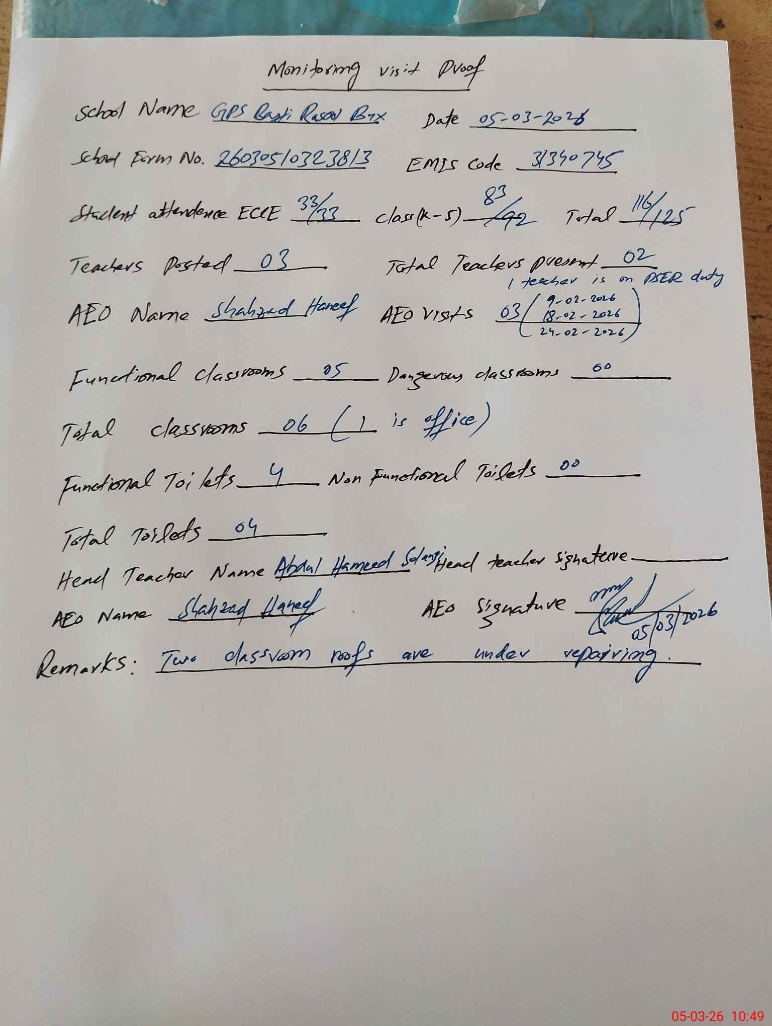 | EMIS Code: 31340745 | Name of School: GPS BASTI RASOOL BUX | |||