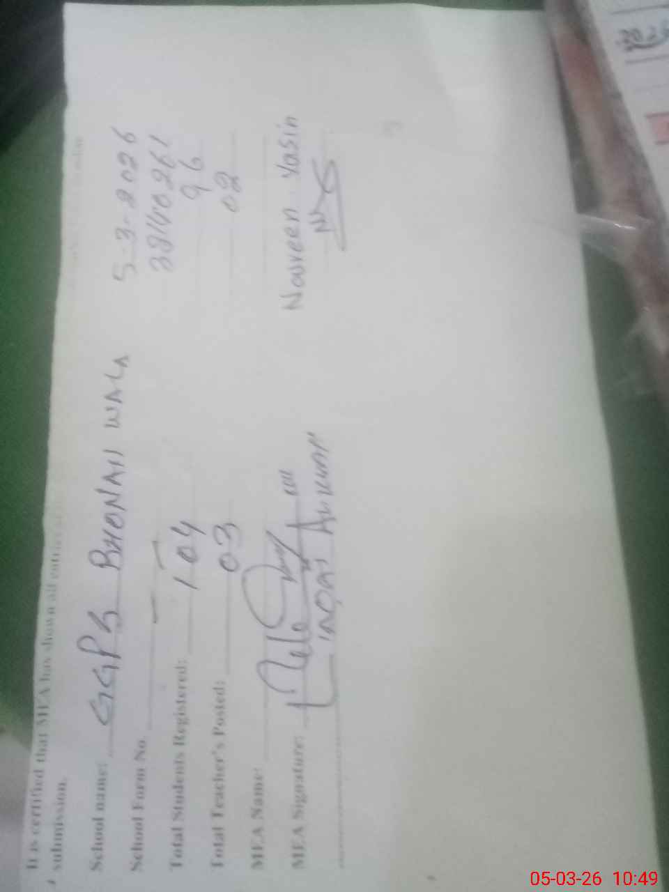 | Name: No**** Ya**** Designation: (School Headmaster's/Headmistress's) PTC/JV Phone/Cell Number: 03**** |