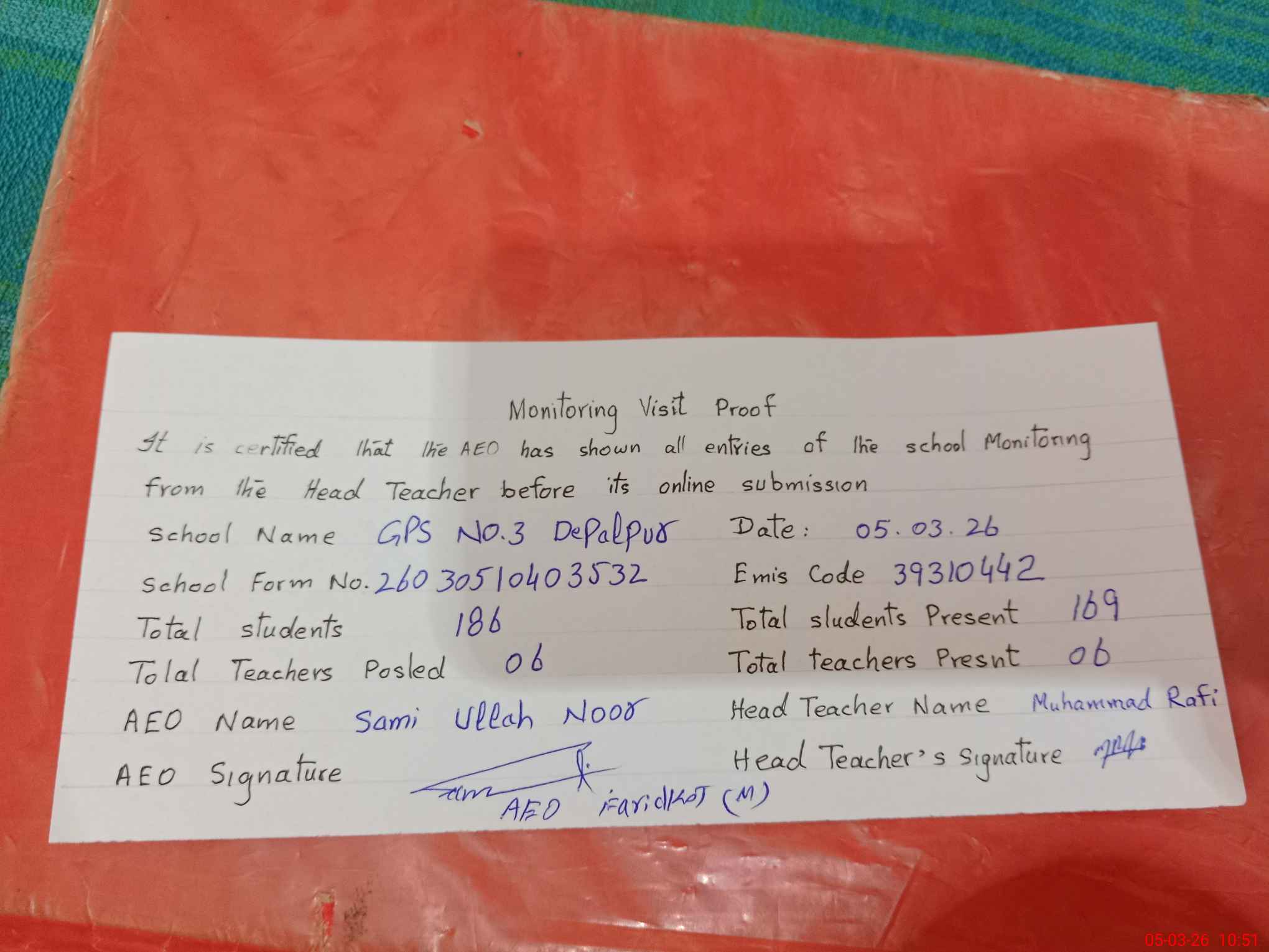 | Attendance Register | Head Teacher | MEA with School | Visit Proof |