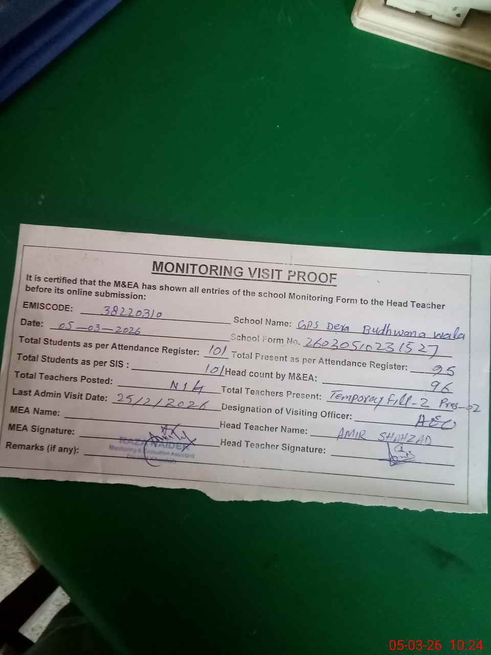 | Remarks (Use Separate Page if Required): AEO VISITED 25/2/26 DEO VISTED 24/2/26 | |||||