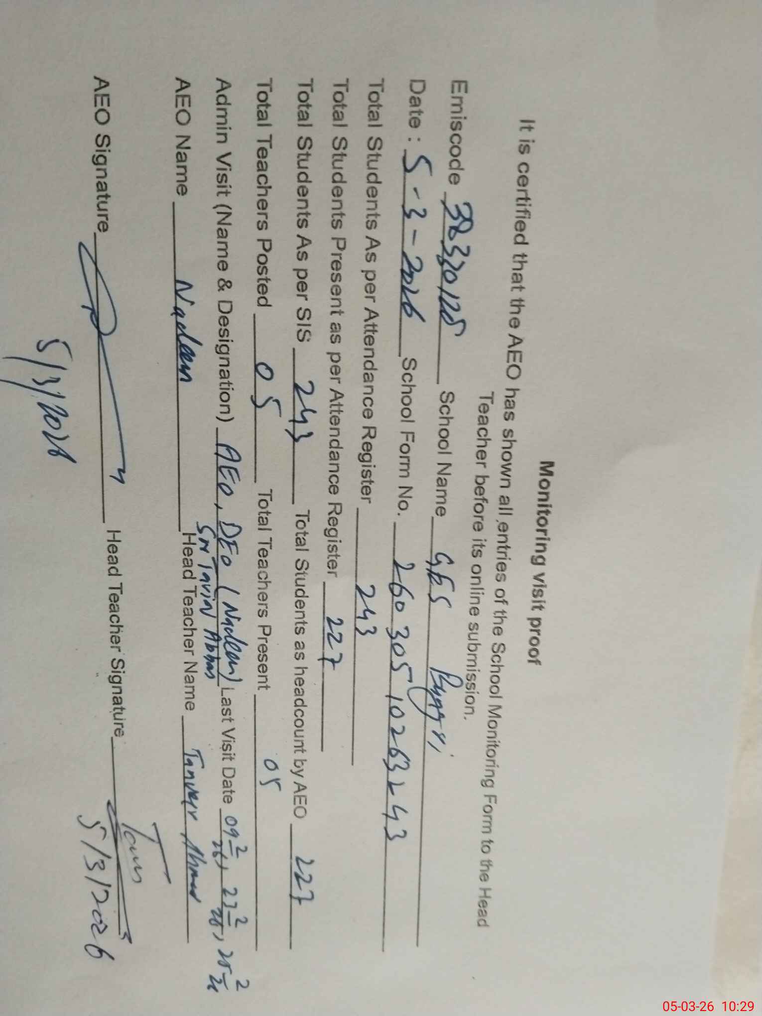 | Certified that this School was Inspected by the Undersigned MEA/DMO Today and the Information Stated Above is as Per Record. | |||||