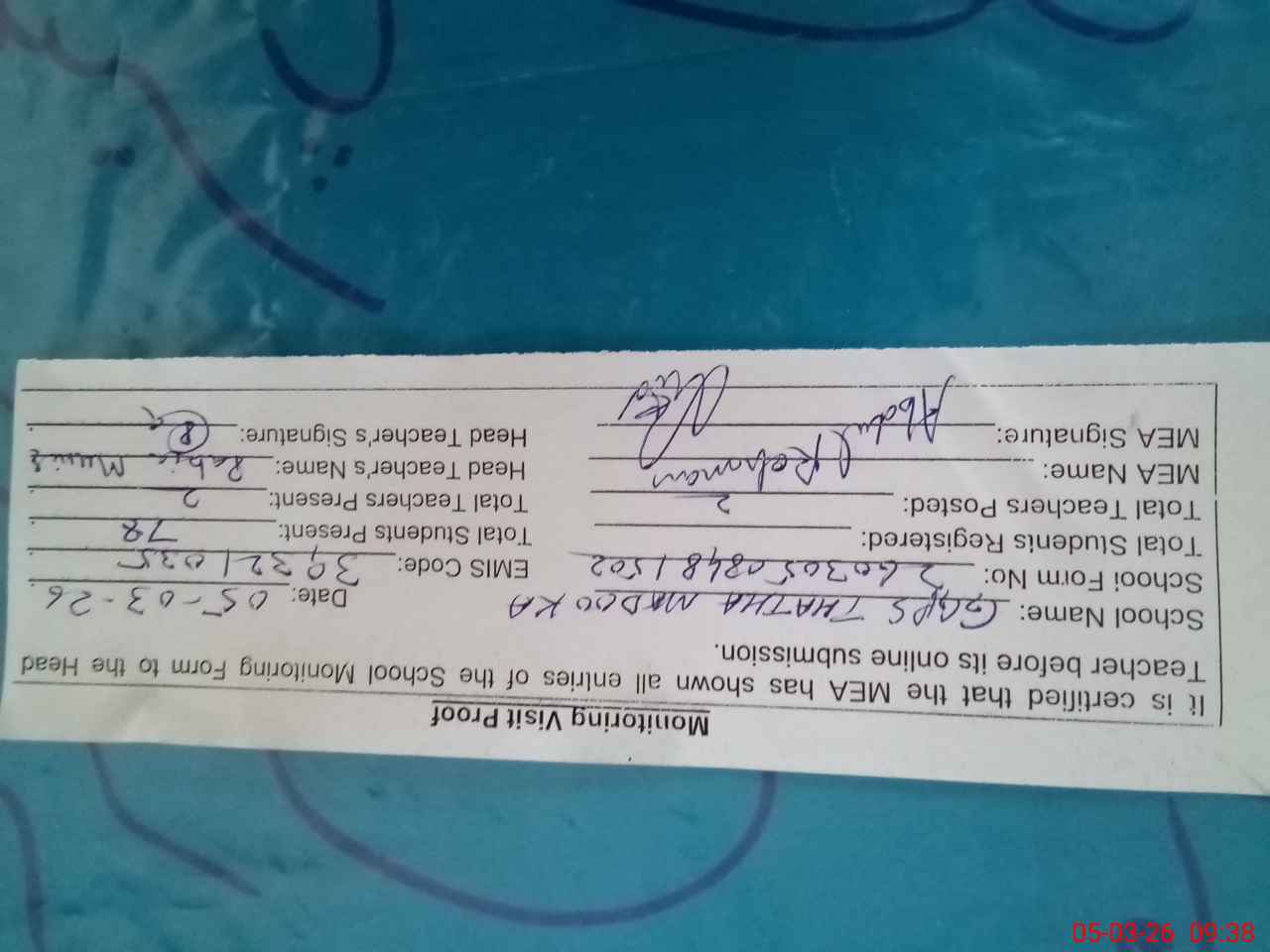 | Attendance Register | Head Teacher | MEA with School | Visit Proof |