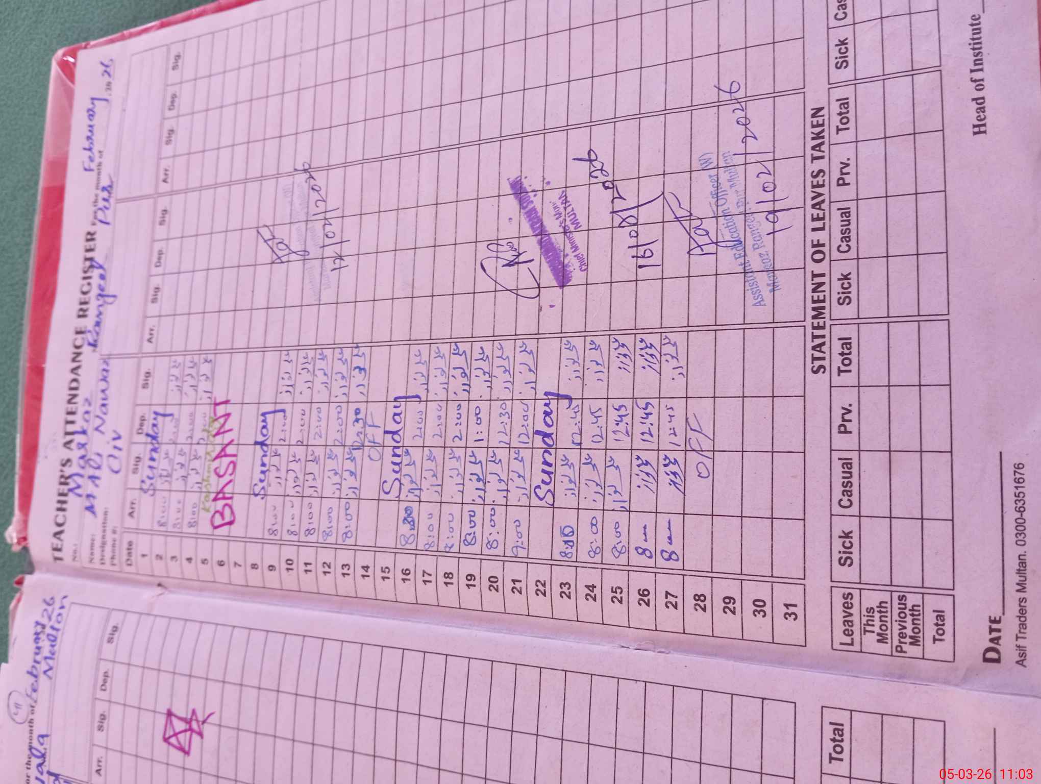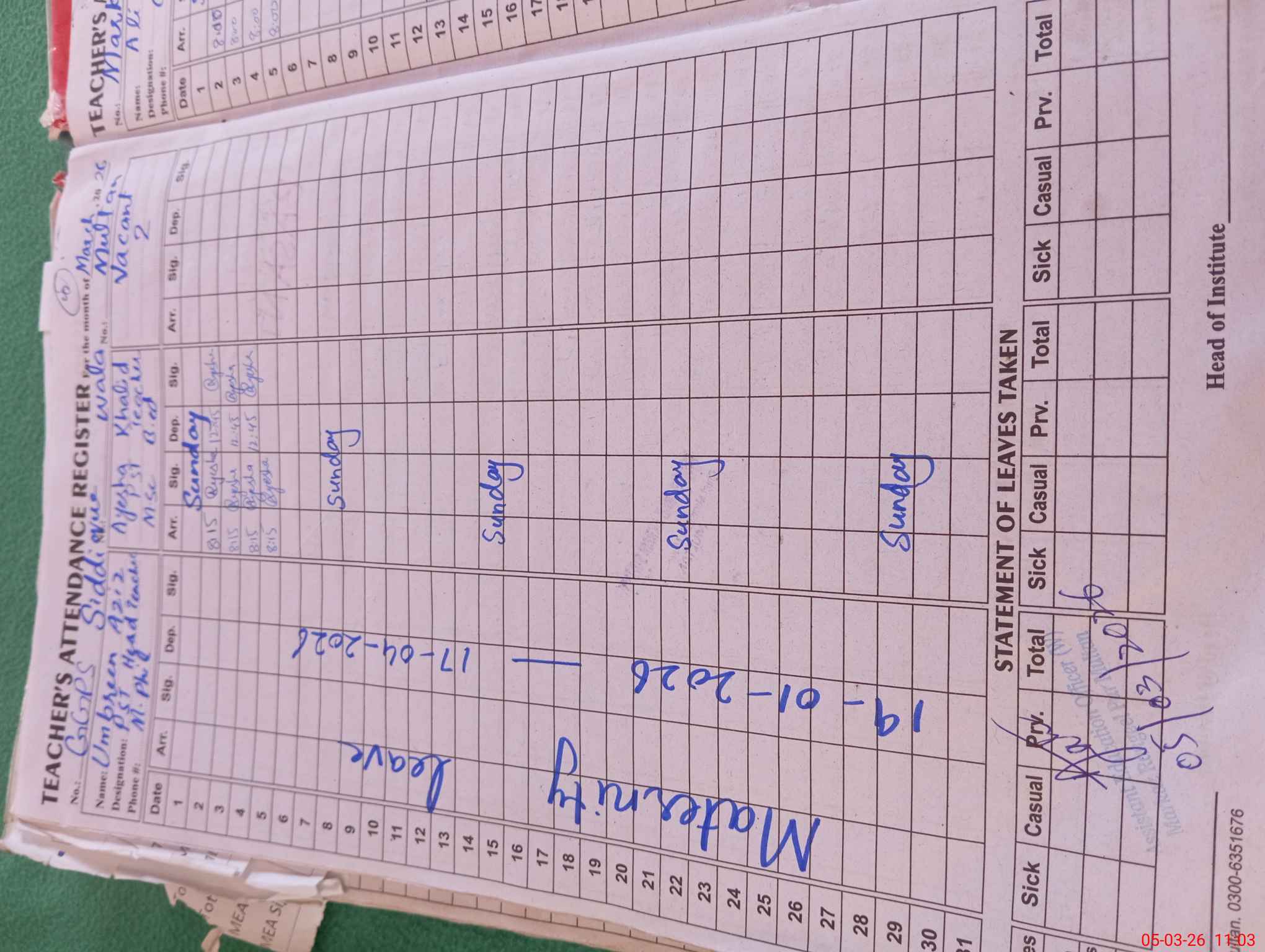 | Name: Um**** Az**** Designation: (School Headmaster's/Headmistress's) HEADMASTER Phone/Cell Number: 03**** |