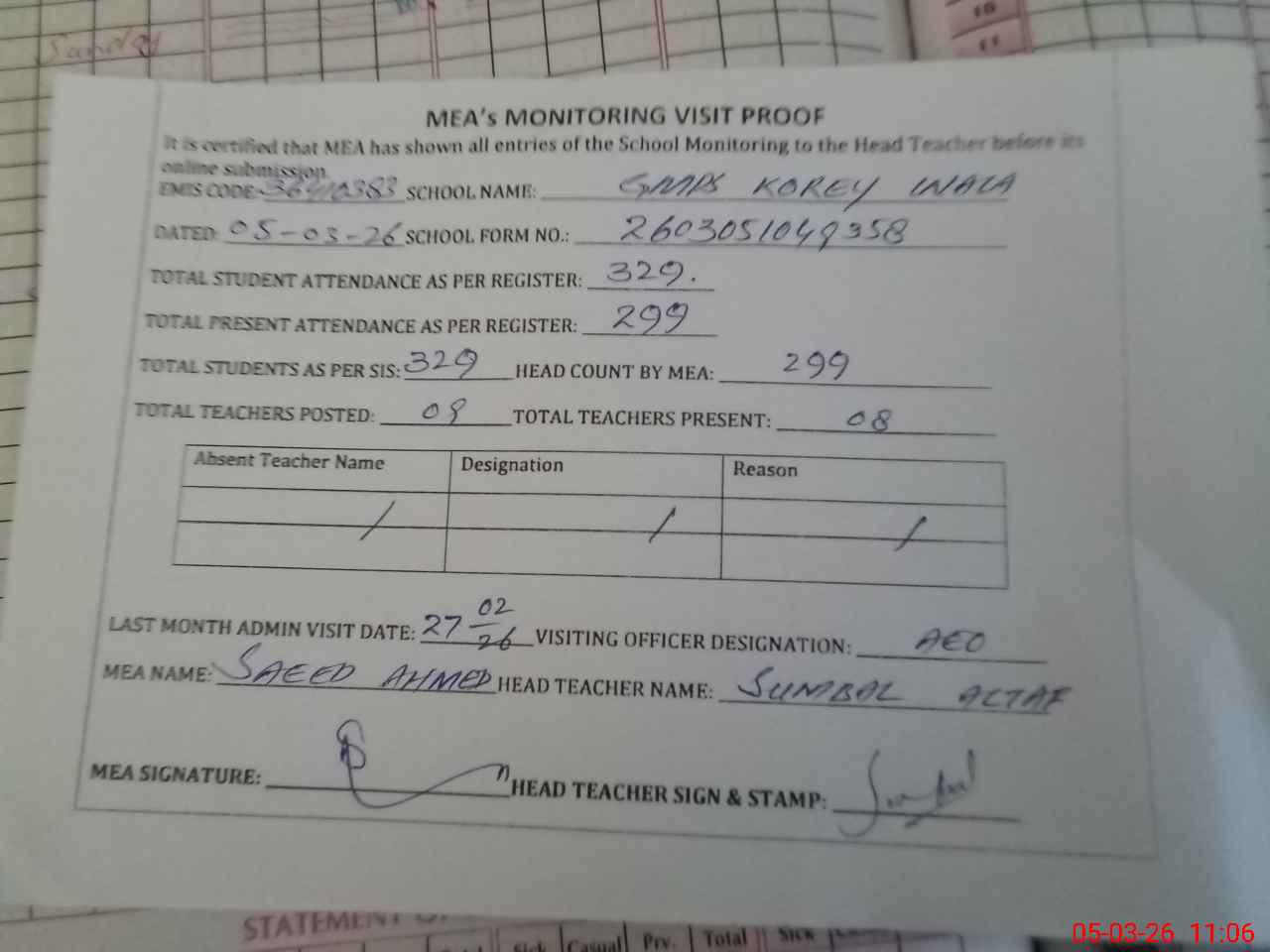 | Attendance Register | Head Teacher | MEA with School | Visit Proof |